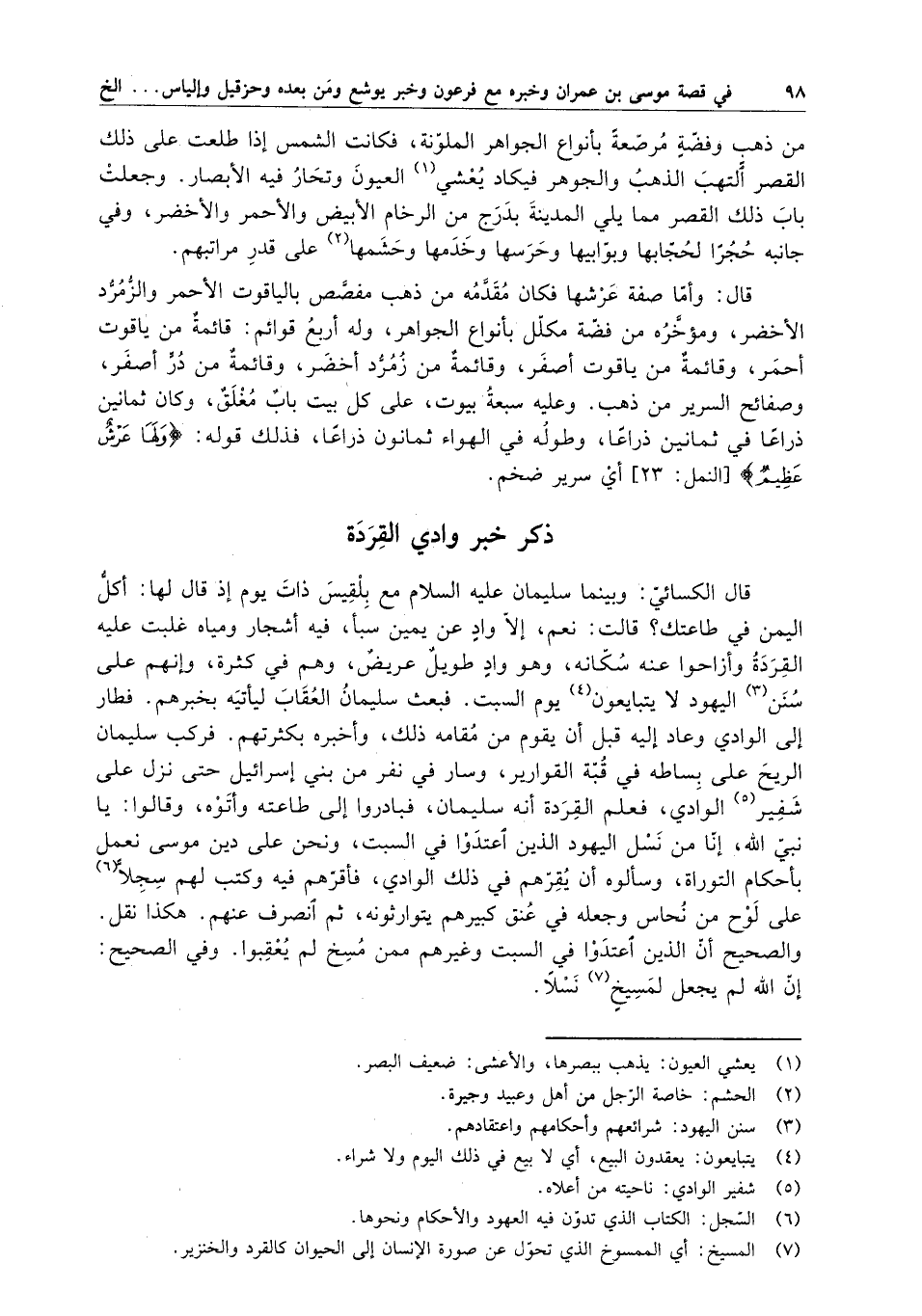 قال الكسائي : وبينما سليمان - ع - مع بلقيس ذات ويوم إذ قال لها : أكل اليمن في طاعتك ؟ قالت : نعم ، إلا واد عن يمين سبأ ، فيه أشجار ومياه غلبت عليه القردة وأزاحوا عنه سكانه ، وهو واد طويل عريض ، وهم في كثرة ، وإنهم على سنن اليهود لا يتبايعون يوم السبت . فبعث سليمان العقاب ليأتيه بخبرهم . فطار إلى الوادي وعاد إليه قبل أن يقوم من مقامه ذلك ، وأخبره بكثرتهم . فركب سليمان الريح على بساطه في قبة القوارير ، وسار في نفر من بني إسرائيل حتى نزل على شفير الوادي ، فعلم القردة أنه سليمان ، فبادروا إلى طاعته وأتوه ، وقالوا : يا نبي الله ، إنا من نسل اليهود الذين اعتدوا في السبت ، ونحن على دين موسى نعمل بأحكام التوراة ، وسألوه أن يقرهم في ذلك الوادي ، فأقرهم فيه وكتب لهم سجلاً على لوح من نحاس وجعله في عنق كبيرهم يتوارثونه ، ثم انصرف عنهم . هكذا نقل . والصحيح أن الذين اعتدوا في السبت وغيرهم ممن مسخ لم يعقبوا . وفي الصحيح : إن الله لم يجعل لمسيخ نسلاً .
