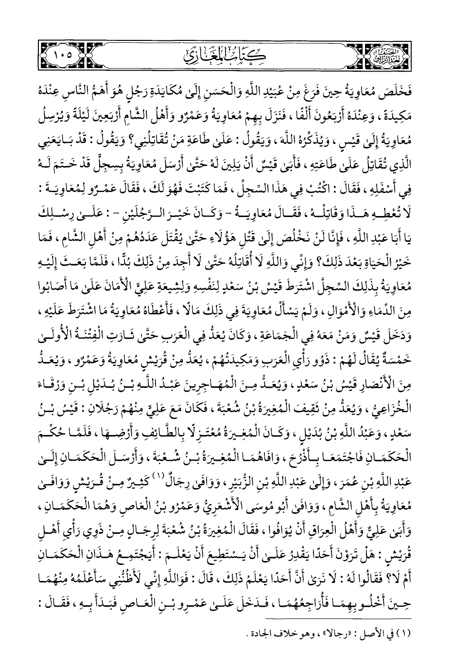 فَخَلَصَ مُعَاوِيَةُ حِينَ فَرَغَ مِنْ عُبَيْدِ اللَّهِ وَالْحَسَنِ إِلَى مُكَايَدَةِ رَجُلٍ هُوَ أَهَمُّ النَّاسِ عِنْدَهُ مَكِيدَة، وَعِنْدَهُ أَرْبَعُونَ أَلْفًا، فَنَزَلَ بِهِمْ مُعَاوِيَةُ وَعَمْرٌو وَأَهْلُ الشَّامِ أَرْبَعِينَ لَيْلَةً وَيُرْسِلُ مُعَاوِيَةُ إِلَى قَيْسٍ، وَيُذَكِّرُهُ اللَّهَ، وَيَقُولُ: عَلَى طَاعَةِ مَنْ تُقَاتِلُنِي؟ وَيَقُولُ: قَدْ بَايَعَنِي الَّذِي تُقَاتِلُ عَلَى طَاعَتِهِ، فَأَبَى قَيْسٌ أَنْ يَلِينَ لَهُ حَتَّى أَرْسَلَ مُعَاوِيَةُ بِسِجِلٍّ قَدْ خَتَمَ لَهُ فِي أَسْفَلِهِ، فَقَالَ: اكْتُبْ فِي هَذَا السِّجِلِّ، فَمَا كَتَبْتَ فَهُوَ لَكَ، فَقَالَ عَمْرٌو لِمُعَاوِيَةَ: لَا تُعْطِهِ هَذَا وَقَاتِلْه، فَقَالَ مُعَاوِيَةُ - وَكَانَ خَيْرَ الرَّجُلَيْنِ -: عَلَى رِسْلِكَ يَا أَبَا عَبْدِ اللَّهِ، فَإِنَّا لَنْ نَخْلُصَ إِلَى قَتْلِ هَؤُلَاءِ حَتَّى يُقْتَلَ عَدَدُهُمْ مِنْ أَهْلِ الشَّامِ، فَمَا خَيْرُ الْحَيَاةِ بَعْدَ ذَلِكَ؟ وإِنِّي وَاللَّهِ لَا أُقَاتِلُهُ حَتَّى لَا أَجِدَ مِنْ ذَلِكَ بُدًّا، فَلَمَّا بَعَثَ إِلَيْهِ مُعَاوِيَةُ بِذَلِكَ السِّجِلَّ اشْتَرَطَ قَيْسُ بْنُ سَعْدِ لِنَفْسِهِ وَلِشِيعَةِ عَلِيٍّ الْأَمَانَ عَلَى مَا أَصَابُوا مِنَ الدِّمَاءَ وَالْأَمْوَالِ، وَلَمْ يَسْأَلْ مُعَاوِيَةَ فِي ذَلِكَ مَالًا، فَأَعْطَاهُ مُعَاوِيَةُ مَا اشْتَرَطَ عَلَيْهِ، وَدَخَلَ قَيْسٌ وَمَنْ مَعَهُ فِي الْجَمَاعَةِ، وَكَانَ يُعَدُّ فِي الْعَرَبِ حَتَّى ثَارَتِ الْفِتْنَةُ الْأُولَى خَمْسَةٌ يُقَالُ لَهُمْ: ذَوُو رَأْيِ الْعَرَبِ وَمَكِيدَتُهُمْ، يُعَدُّ مِنْ قُرَيْشٍ مُعَاوِيَةُ وَعَمْرٌو، وَيُعَدُّ مِنَ الْأَنْصَارِ قَيْسُ بْنُ سَعْدٍ، وَيُعَدُّ مِنَ الْمُهَاجِرِينَ عَبْدُ اللَّهِ بْنُ بُدَيْلِ بْنِ وَرْقَاءَ الْخُزَاعِيُّ، وَيُعَدُّ مِنْ ثَقِيفَ الْمُغِيرَةُ بْنُ شُعْبَةَ، فَكَانَ مَعَ عَلِيٍّ مِنْهُمْ رَجُلَانِ: قَيْسُ بْنُ سَعْدٍ، وَعَبْدُ اللَّهِ بْنُ بُدَيْلٍ، وَكَانَ الْمُغِيرَةُ مُعْتَزِلًا بِالطَّائِفِ وَأَرْضِهَا، فَلَمَّا حُكِّمَ الْحَكَمَانِ فَاجْتَمَعَا بِأَذْرُحَ، وَافَاهُمَا الْمُغِيرَةُ بْنُ شُعْبَةَ، وَأَرْسَلَ الْحَكَمَانِ إِلَى عَبْدِ اللَّهِ بْنِ عُمَرَ، وإلَى عَبْدِ اللَّهِ بْنِ الزُّبَيْرِ، وَوَافَى رِجَالٌ (¬١) كَثِيرٌ مِنْ قُرَيْشٍ وَوَافَى مُعَاوِيَةُ بِأَهْلِ الشَّامِ، وَوَافَى أَبُو مُوسَى الْأَشْعَرِيُّ وَعَمْرُو بْنُ الْعَاصِ وَهُمَا الْحَكَمَانِ، وَأَبَى عَلِيٌّ وَأَهْلُ الْعِرَاقِ أَنْ يُوَافُوا، فَقَالَ الْمُغِيرَةُ بْنُ شُعْبَةَ لِرِجَالٍ مِنْ ذَوِي رَأْيِ أَهْلِ قُرَيْشٍ: هَلْ تَرَوْنَ أَحَدًا يَقْدِرُ عَلَى أَنْ يَسْتَطِيعَ أَنْ يَعْلَمَ: أَيَجْتَمِعُ هَذَانِ الْحَكَمَانِ أَمْ لَا؟ فَقَالُوا لَهُ: لَا نَرَى أَنَّ أَحَدًا يَعْلَمُ ذَلِكَ، قَالَ: فَوَاللهِ إِنِّي لأَظُنُّنِي سَأَعْلَمُهُ مِنْهُمَا حِينَ أَخْلُو بِهِمَا فَأُرَاجِعُهُمَا، فَدَخَلَ عَلَى عَمْرِو بْنِ الْعَاصِ فَبَدَأَ بِهِ، فَقَالَ: