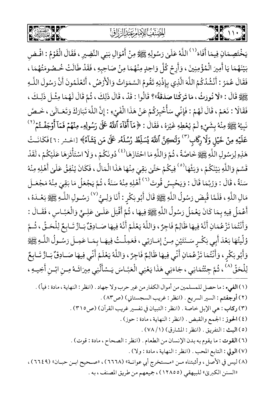يَخْتَصِمَانِ فِيمَا أَفَاءَ (¬١) اللَّهُ عَلَى رَسُولِهِ - صلى الله عليه وسلم - مِنْ أَمْوَالِ بَنِي النَّضِيرِ، فَقَالَ الْقَوْمُ: اقْضِ بَيْنَهُمَا يَا أَمِيرَ الْمُؤْمِنِينَ، وَأَرِحْ كُلَّ وَاحِدٍ مِنْهُمَا مِنْ صَاحِبِهِ، فَقَدْ طَالَتْ خُصومَتُهُمَا، فَقَالَ عُمَرُ: أَنْشُدُكُمُ اللَّهَ الَّذِي بِإِذْنِهِ تَقُومُ السَّمَوَاتُ وَالْأَرْض، أَتَعْلَمُونَ أَنَّ رَسُولَ اللَّهِ - صلى الله عليه وسلم - قَالَ: "لَا نُورَث، مَا تَرَكنَا صَدَقَةٌ"؟ قَالُوا: قَدْ، قَالَ ذَلِكَ، ثُمَّ قَالَ لَهُمَا مِثْلَ ذَلِكَ، فَقَالَا: نَعَمْ، قَالَ لَهُمْ: فَإِنِّي سَأُخْبِرُكُمْ عَنْ هَذَا الْفَيْءَ: إِنَّ اللَّهَ تَبَارَكَ وَتَعَالَى، خَصَّ نَبِيَّهُ - صلى الله عليه وسلم - مِنْهُ بِشَيءٍ لَمْ يُعْطِهِ غَيْرَه، فَقَالَ {وَمَا أَفَاءَ اللَّهُ عَلَى رَسُولِهِ مِنْهُمْ فَمَا أَوْجَفْتُمْ (¬٢) عَلَيْهِ مِنْ خَيْلٍ وَلَا رِكَابٍ (¬٣) وَلَكِنَّ اللَّهَ يُسَلِّطُ رُسُلَهُ عَلَى مَنْ يَشَاءُ} [الحشر: ٦]، فَكَانَتْ هَذِهِ لِرَسُولِ اللهِ - صلى الله عليه وسلم - خَاصَّةً، ثُمَّ وَاللَّهِ مَا احْتَازَهَا (¬٤) دُونَكُمْ، وَلَا اسْتَأْثَرَهَا عَلَيْكُمْ، لَقَدْ قَسَّمَ وَاللَّهِ بَيْنَكُمْ، وَبَثَّهَا (¬٥) فِيكُمْ حَتَّى بَقِيَ مِنْهَا هَذَا الْمَال، فَكَانَ يُنْفِقُ عَلَى أَهْلِهِ مِنْهُ سَنَةً، قَالَ: وَرُبَّمَا قَالَ: وَيَحْبِسُ قُوتَ (¬٦) أَهْلِهِ مِنْهُ سَنَةً، ثُمَّ يَجْعَلُ مَا بَقِيَ مِنْهُ مَجْعَلَ مَالِ اللَّهِ، فَلَمَّا قُبِضَ رَسُولُ اللَّهِ - صلى الله عليه وسلم - قَالَ أَبُو بَكْرٍ: أَنَا وَلِيُّ (¬٧) رَسُولِ اللَّهِ - صلى الله عليه وسلم - بعْدَه، أَعْمَلُ فِيهِ بِمَا كَانَ يَعْمَلُ رَسُولُ اللَّهِ - صلى الله عليه وسلم - فِيهَا، ثُمَّ أَقْبَلَ عَلَى عَلِيٍّ وَالْعَبَّاسٍ، فَقَالَ: وَأَنْتُمَا تَزْعُمَانِ أَنِّي فِيهَا ظَالِمٌ فَاجِرٌ، وَاللَّهُ يَعْلَمُ أَنِّي فِيهَا صادِقٌ بَارٌّ تَابِعٌ لِلْحَقِّ، ثُمَّ وُلِّيتُهَا بَعْدَ أَبِي بَكْرٍ سَنَتَيْنِ مِنْ إِمَارَتِي، فَعَمِلْتُ فِيهَا بِمَا عَمِلَ رَسُولُ اللَّهِ - صلى الله عليه وسلم - وَأَبُو بَكْرٍ، وَأَنْتُمَا تَزْعُمَانِ أَنِّي فِيهَا ظَالِمٌ فَاجِرٌ، وَاللَّهُ يَعْلَمُ أَنِّي فِيهَا صَادِقٌ بَارٌّ تَابِعٌ لِلْحَقِّ (¬٨)، ثُمَّ جِئْتُمَانِي، جَاءَنِي هَذَا يَعْنِي الْعَبَّاسَ يَسْأَلُنِي مِيرَاثَهُ مِنِ ابْنِ أَخِيهِ،