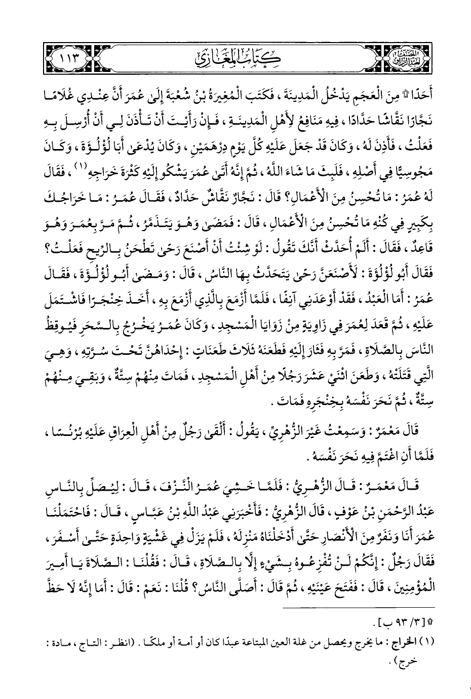 أَحَدًا * مِنَ الْعَجَمِ يَدْخُلُ الْمَدِينَةَ، فَكَتَبَ الْمُغِيرَةُ بْنُ شُعْبَةَ إِلَى عُمَرَ أَنَّ عِنْدِي غُلَامًا نَجَّارًا نَقَّاشًا حَدَّادًا، فِيهِ مَنَافِعُ لِأَهْلِ الْمَدِينَةِ، فَإِنْ رَأَيْتَ أَنْ تَأْذَنَ لِي أَنْ أُرْسِلَ بِهِ فَعَلْت، فَأَذِنَ لَه، وَكَانَ قَدْ جَعَلَ عَلَيْهِ كُلَّ يَوْمٍ دِرْهَمَيْنِ، وَكَانَ يُدْعَى أَبَا لُؤْلُوَّةَ، وَكَانَ مَجُوسِيًّا فِي أَصْلِهِ، فَلَبِثَ مَا شَاءَ اللَّه، ثُمَّ إِنَّهُ أَتَى عُمَرَ يَشْكُو إِلَيْهِ كَثْرَةَ خَرَاجِهِ (¬١)، فَقَالَ لَهُ عُمَرُ: مَا تُحْسِنُ مِنَ الْأَعْمَالِ؟ قَالَ: نَجَّارٌ نَقَّاشٌ حَدَّادٌ، فَقَالَ عُمَرُ: مَا خَرَاجُكَ بِكَبِيرِ فِي كُنْهِ مَا تُحْسِنُ مِنَ الْأَعْمَالِ، قَالَ: فَمَضَى وَهُوَ يَتَذَمَّر، ثُمَّ مَرَّ بِعُمَرَ وَهُوَ قَاعِدٌ، فَقَالَ: أَلَمْ أُحَدَّثْ أَنَّكَ تَقُولُ: لَوْ شِئْتُ أَنْ أَصنَعَ رَحًى تَطْحَنُ بِالرِّيحِ فَعَلْتُ؟ فَقَالَ أَبُو لُؤْلُوَّةَ: لأَصْنَعَنَّ رَحًى يَتَحَدَّثُ بِهَا النَّاس، قَالَ: وَمَضَى أَبُو لُؤْلُوَّةَ، فَقَالَ عُمَرُ: أَمَا الْعَبْد، فَقَدْ أَوْعَدَنِي آنِفًا، فَلَمَّا أَزْمَعَ بِالَّذِي أَزْمَعَ بِهِ، أَخَذَ خِنْجَرًا فَاشْتَمَلَ عَلَيْهِ، ثُمَّ قَعَدَ لِعُمَرَ فِي زَاوِيَةٍ مِنْ زَوَايَا الْمَسْجِدِ، وَكَانَ عُمَرُ يَخْرُجُ بِالسَّحَرِ فَيُوقِظُ النَّاسَ بِالصَّلَاةِ، فَمَرَّ بِهِ فَثَارَ إِلَيْهِ فَطَعَنَهُ ثَلَاثَ طَعَنَاتٍ: إِحْدَاهُنَّ تَحْتَ سُرَّتِهِ، وَهِيَ الَّتِي قَتَلَتْه، وَطَعَنَ اثْنَي عَشَرَ رَجُلًا مِنْ أَهْلِ الْمَسْجِدِ، فَمَاتَ مِنْهُمْ سِتَّةٌ، وَبَقِيَ مِنْهُمْ سِتَّةٌ، ثُمَّ نَحَرَ نَفْسَهُ بِخِنْجَرِهِ فَمَاتَ.