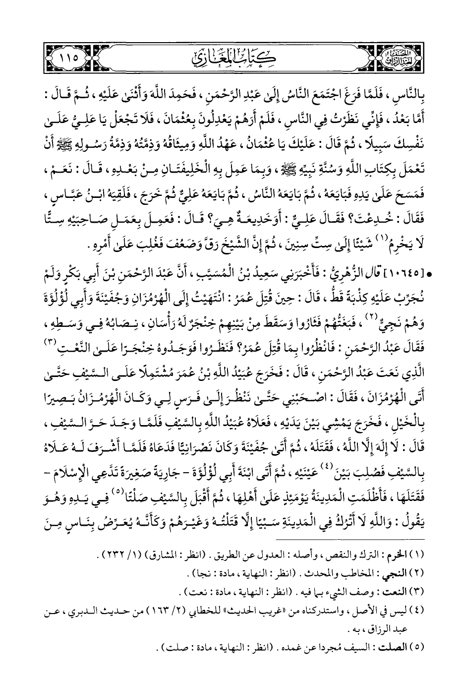 • [١٠٦٤٥] قال الزُّهْرِيُّ: فَأَخْبَرَنِي سَعِيدُ بْنُ الْمُسَيَّبِ، أَنَّ عَبْدَ الرَّحْمَنِ بْنَ أَبِي بَكْرٍ وَلَمْ نُجَرِّبْ عَلَيْهِ كِذْبَةَ قَطُّ، قَالَ: حِينَ قُتِلَ عُمَرُ: انْتَهَيْتُ إِلَى الْهُرْمُزَانِ وَجُفَيْنَةَ وَأَبِي لُؤْلُؤَةَ وَهُمْ نَجِيٌّ (¬٢)، فبَغَتُّهُمْ فَثَارُوا وَسَقَطَ مِنْ بَيْنِهِمْ خِنْجَرٌ لَهُ رَأْسَانِ، نِصَابُهُ فِي وَسَطِهِ، فَقَالَ عَبْدُ الرَّحْمَنِ: فَانْظُرُوا بِمَا قُتِلَ عُمَرُ؟ فَنَظَرُوا فَوَجَدُوهُ خِنْجَرًا عَلَى النَّعْتِ (¬٣) الَّذِي نَعَتَ عَبْدُ الرَّحْمَنِ، قَالَ: فَخَرَجَ عُبَيْدُ اللَّهِ بْنُ عُمَرَ مُشْتَمِلًا عَلَى السَّيْفِ حَتَّى أَتَى الْهُزمُزَانَ، فَقَالَ: اصْحَبْنِي حَتَّى نَنْظُرَ إِلَى فَرَسٍ لِي وَكَانَ الْهُرْمُزَانُ بَصيرًا بِالْخَيْلِ، فَخَرَجَ يَمْشِي بَيْنَ يَدَيْهِ، فَعَلَاهُ عُبَيْدُ اللَّهِ بِالسَّيْفِ فَلَمَّا وَجَدَ حَرَّ السَّيْفِ، قَالَ: لَا إِلَهَ إِلَّا اللَّه، فَقَتَلَه، ثُمَّ أَتَى جُفَيْنَةَ وَكَانَ نَصْرَانِيًّا فَدَعَاهُ فَلَمَّا أَشْرَفَ لَهُ عَلَاهُ بِالسَّيْفِ فَصُلِبَ بَيْنَ (¬٤) عَيْنَيْهِ، ثُمَّ أَتَى ابْنَةَ أبِي لُؤْلُؤَةَ - جَارِيَةً صَغِيرَة تَدَّعِي الْإِسْلَامَ - فَقَتَلَهَا، فَأَظْلَمَتِ الْمَدِينَةُ يَوْمَئِذٍ عَلَى أَهْلِهَا، ثُمَّ أَقْبَلَ بِالسَّيْفِ صَلْتًا (¬٥) فِي يَدِهِ وَهُوَ يَقُولُ: وَاللَّهِ لَا أَتْرُكُ فِي الْمَدِينَةِ سَبْيًا إِلَّا قَتَلْتُهُ وَغَيْرَهُمْ وَكَأَنَّهُ يُعَرِّضُ بِنَاسٍ مِنَ