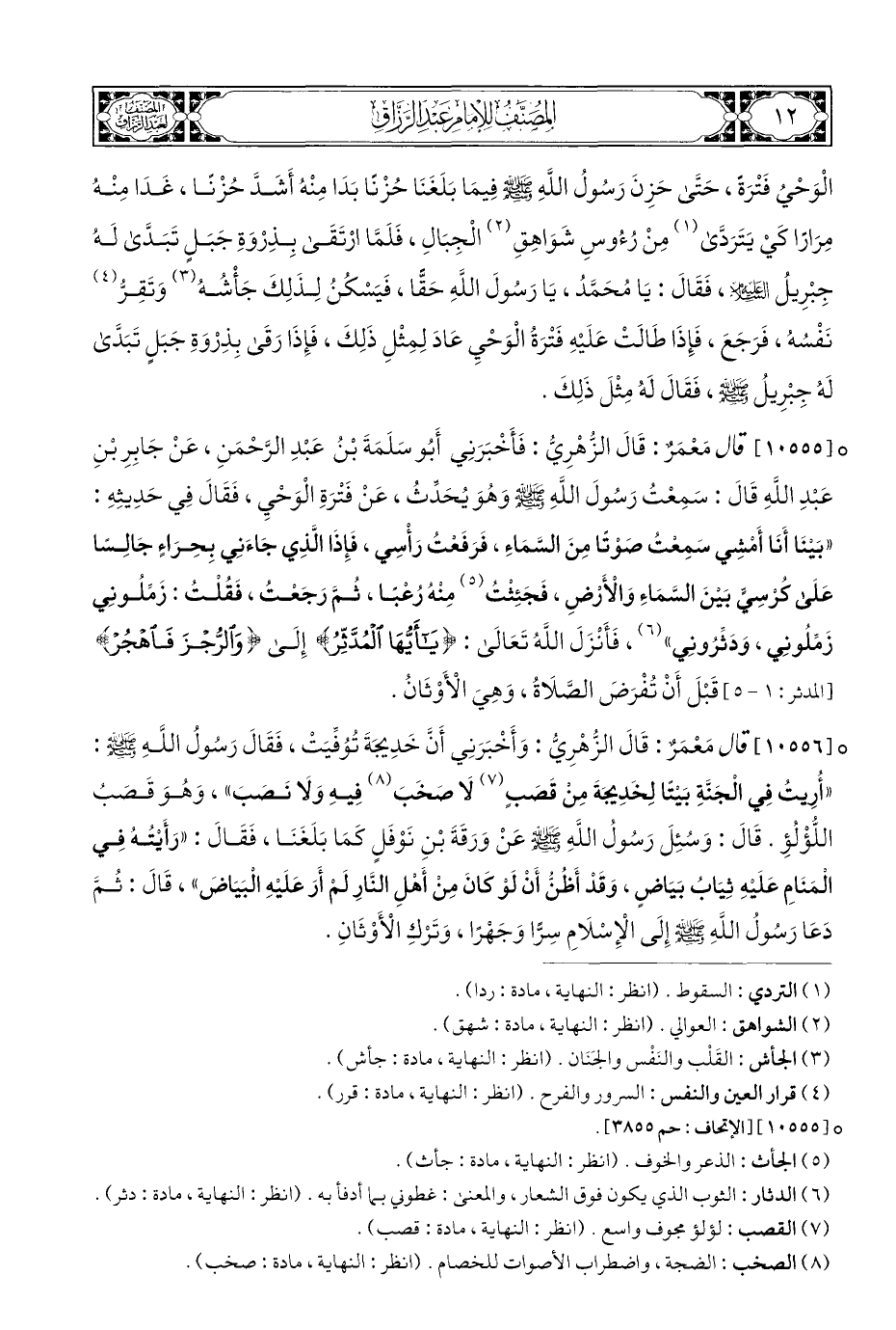° [١٠٥٥٥] قال مَعْمَرٌ: قَالَ الزُهْرِيُّ: فَأَخْبَرَنِي أَبُو سَلَمَةَ بْنُ عَبدِ الرَّحْمَنِ، عَنْ جَابِرِ بْنِ عَبدِ اللهِ قَالَ: سَمِعْتُ رَسُولَ اللَّهِ - صلى الله عليه وسلم - وهُوَ يُحَدِّثُ، عَنْ فَترَةِ الْوَحْيِ، فَقَالَ فِي حَدِيثِهِ: "بَينَا أَنَا أَمشِي سَمِعتُ صَوْتًا مِنَ السَّمَاءِ، فَرَفَعتُ رَأْسِي، فَإِذَا الَّذِي جَاءَنِي بِحِرَاءٍ جَالِسًا عَلَى كُرسِيٍّ بَينَ السَّمَاءِ وَالأَرضِ، فَجَئِثتُ (¬٥) مِنهُ رُعبًا، ثُمَّ رَجَعْتُ، فَقُلتُ: زَمِّلُونِي زَمِّلُونِي، وَدَثِّرُونِي" (¬٦)، فَأَنرلَ اللَّهُ تَعَالَى: {يَاأَيُّهَا الْمُدَّثِّرُ} إِلَى {وَالرُّجْزَ فَاهْجُرْ} [المدثر: ١ - ٥] قَبْلَ أَنْ تُفْرَضَ الصَّلَاةُ، وَهِيَ الْأَوْثَانُ.