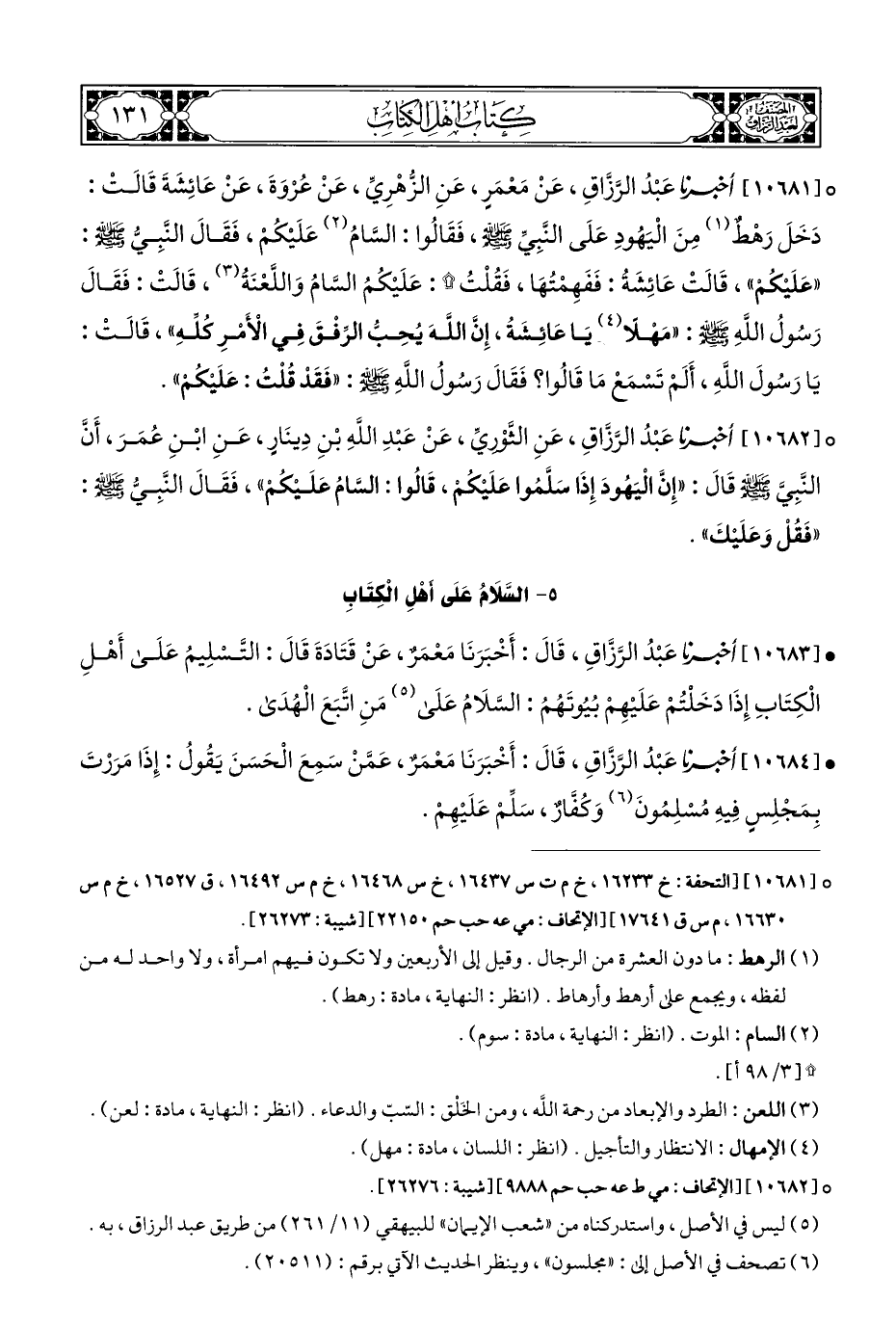 ° [١٠٦٨١] أخبرنا عَبْدُ الرَّزَّاقِ، عَنْ مَعْمَر، عَنِ الزُّهْرِيِّ، عَنْ عُرْوَةَ، عَنْ عَائِشَةَ قَالَتْ: دَخَلَ رَهْطٌ (¬١) مِنَ الْيَهُودِ عَلَى النَّبِيِّ - صلى الله عليه وسلم -، فَقَالُوا: السَّامُ (¬٢) عَلَيْكُمْ، فَقَالَ النبِيُّ - صلى الله عليه وسلم -: "عَلَيْكُمْ"، قَالَتْ عَائِشَةُ: فَفَهِمْتُهَا، فَقُلْتُ *: عَلَيْكُمُ السَّامُ وَاللَّعْنَةُ (¬٣)، قَالَتْ: فَقَالَ رَسُولُ اللَّهِ - صلى الله عليه وسلم -: "مَهْلًا (¬٤) يَا عَائِشَة، إِن اللهَ يُحِبُّ الرِّفْقَ فِي الْأَمْرِ كُلَّهِ"، قَالَتْ: يَا رَسُولَ اللَّهِ، أَلَمْ تَسْمَعْ مَا قَالُوا؟ فَقَالَ رَسُولُ اللَّهِ - صلى الله عليه وسلم -: "فَقَدْ قُلْتُ: عَلَيْكُمْ".