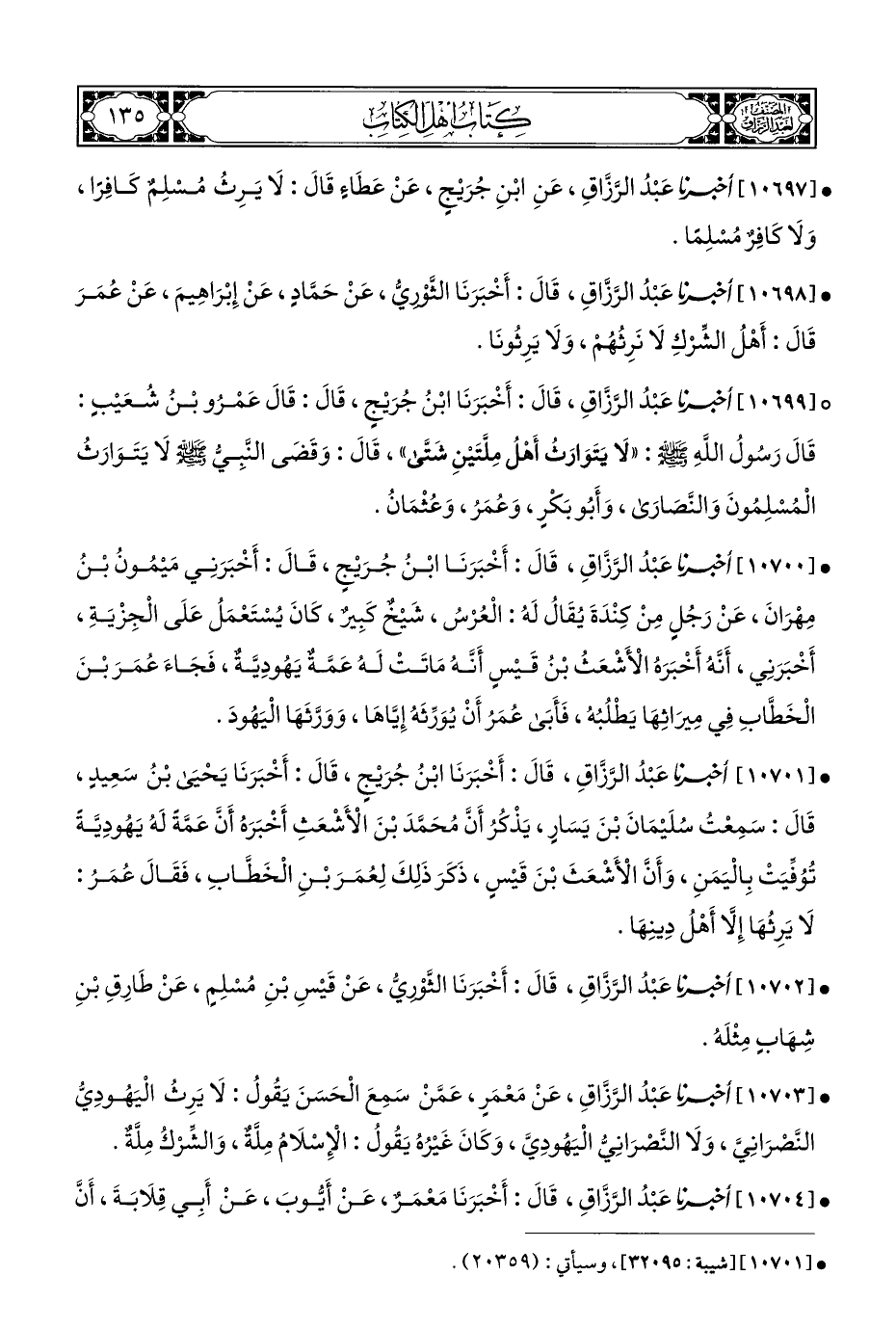 ° [١٠٧٠٠] أخبرنا عَبْدُ الرَّزَّاقِ، قَالَ: أَخْبَرَنَا ابْنُ جُرَيْجٍ، قَالَ: أَخْبَرَنِي مَيْمُونُ بْنُ مِهْرَانَ، عَنْ رَجُلٍ مِنْ كِنْدَةَ يُقَالُ لَهُ: الْعُرْس، شَيْخٌ كَبِيرٌ، كَانَ يُسْتَعْمَلُ عَلَى الْجِزْيَةِ، أَخْبَرَنِي، أَنَّهُ أَخْبَرَهُ الْأَشْعَثُ بْنُ قَيْسٍ أَنَّهُ مَاتَتْ لَهُ عَمَّةٌ يَهُودِيَّةٌ، فَجَاءَ عُمَرَ بْنَ الْخَطَّابِ فِي مِيرَاثِهَا يَطْلُبُه، فَأَبَى عُمَرُ أَنْ يُوَرِّثَهُ إِيَّاهَا، وَوَرَّثَهَا الْيَهُودَ.