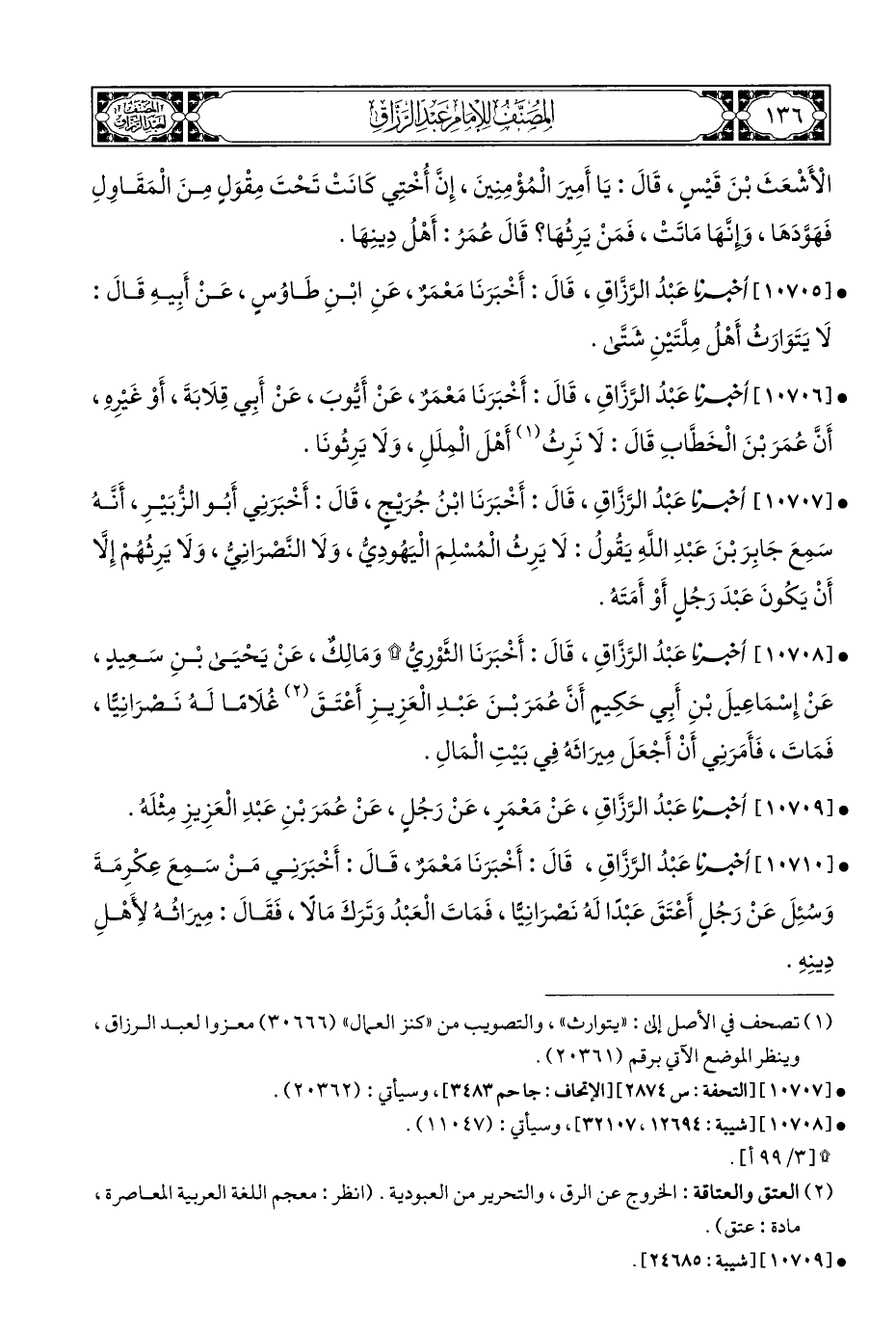 • [١٠٧٠٨] أخبرنا عَبْدُ الرَّزَّاقِ، قَالَ: أَخْبَرَنَا الثَّوْرِيُّ * وَمَالِكٌ، عَنْ يَحْيَى بْنِ سَعِيدٍ، عَنْ إِسْمَاعِيلَ بْنِ أَبِي حَكِيمٍ أَنَّ عُمَرَ بْنَ عَبْدِ الْعَزِيزِ أَعْتَقَ (¬٢) غُلَامًا لَهُ نَصْرَانِيًّا، فَمَاتَ، فَأَمَرَنِي أَنْ أَجْعَلَ مِيرَاثَهُ فِي بَيْتِ الْمَالِ.