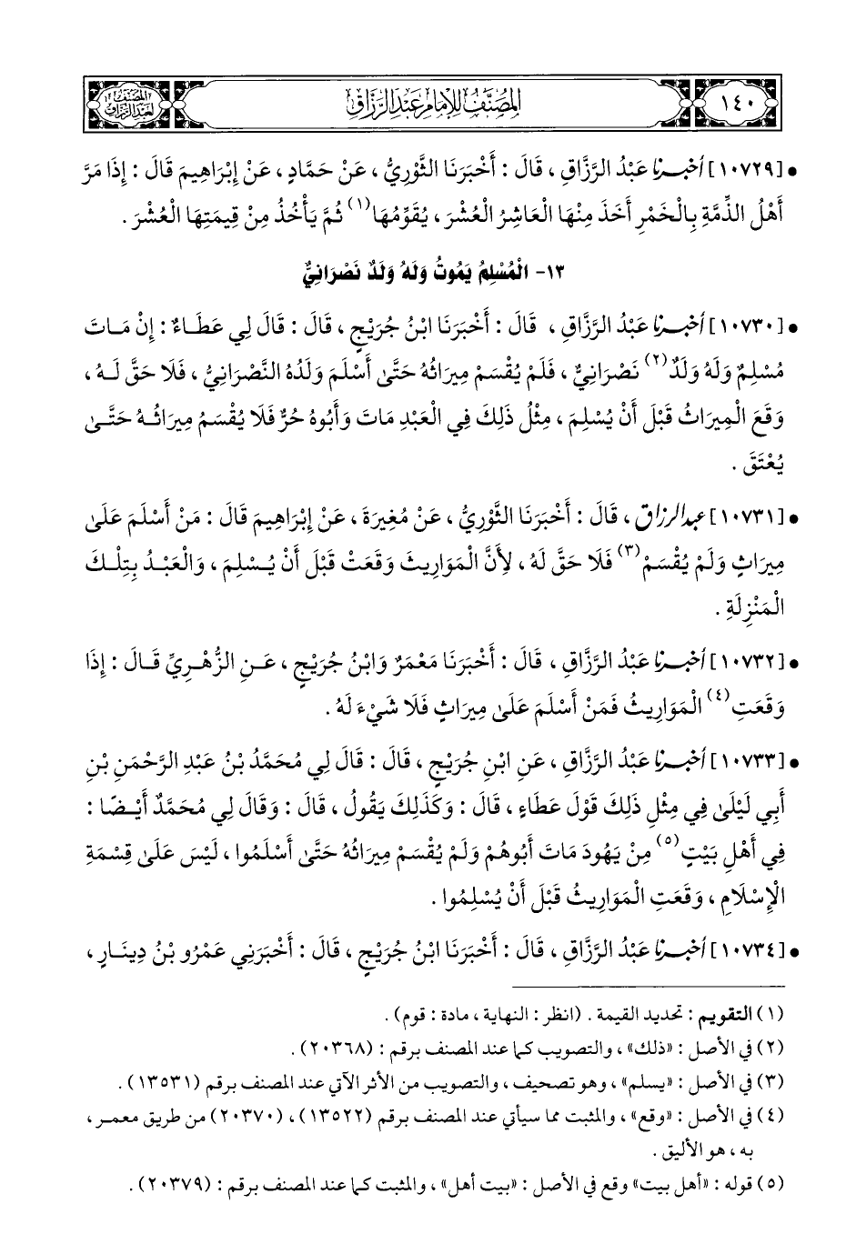 • [١٠٧٣٠] أخبرنا عَبْدُ الرَّزَّاقِ، قَالَ: أَخْبَرَنَا ابْنُ جُرَيْجٍ، قَالَ: قَالَ لِي عَطَاءٌ: إِنْ مَاتَ مُسْلِم وَلَهُ وَلَد (¬٢) نَصْرَانِيٌّ، فَلَمْ يُقْسَمْ مِيرَاثُهُ حَتَّى أَسْلَمَ وَلَدُهُ النَّصْرَانِيُّ، فَلَا حَقَّ لَه، وَقَعَ الْمِيرَاثُ قَبْلَ أَنْ يُسْلِمَ، مِثْلُ ذَلِكَ فِي الْعَبْدِ مَاتَ وَأَبُوهُ حُرٌّ فَلَا يُقْسَمُ مِيرَاثُهُ حَتَّى يُعْتَقَ.