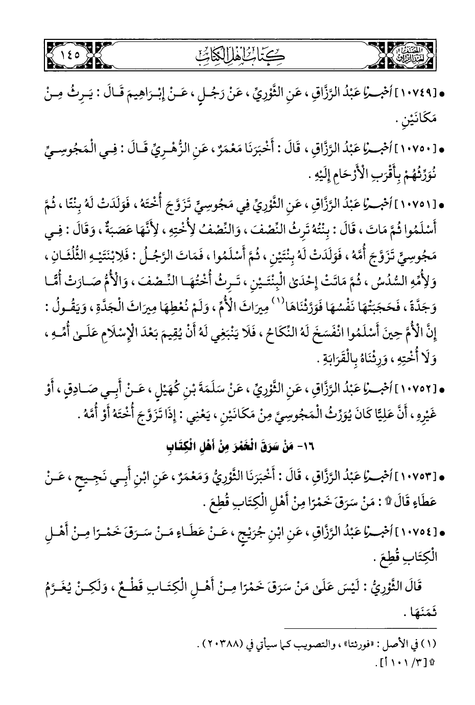 • [١٠٧٥٠] أخبرنا عَبْدُ الرَّزَّاقِ، قَالَ: أَخْبَرَنَا مَعْمَرٌ، عَنِ الزُّهْرِيِّ قَالَ: فِي الْمَجُوسِيِّ نُوَرِّثُهُمْ بِأَقْرَبِ الْأَرْحَامِ إِلَيْهِ.