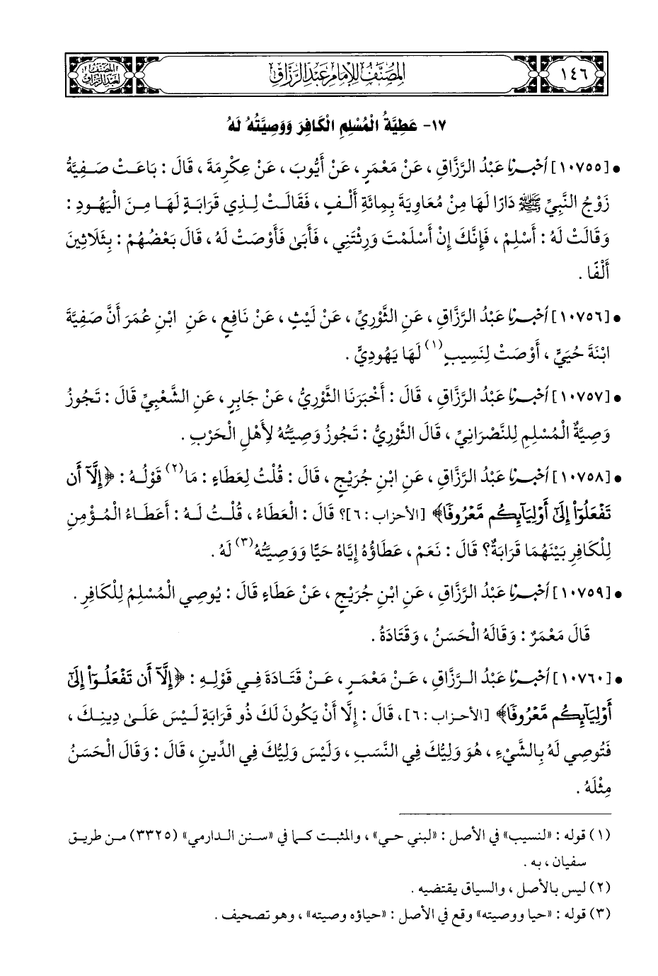 • [١٠٧٥٩] أخبرنا عَبْدُ الرَّزاقِ، عَنِ ابْنِ جُرَيْجٍ، عَنْ عَطَاءٍ قَالَ: يُوصي الْمُسْلِمُ لِلْكَافِرِ.