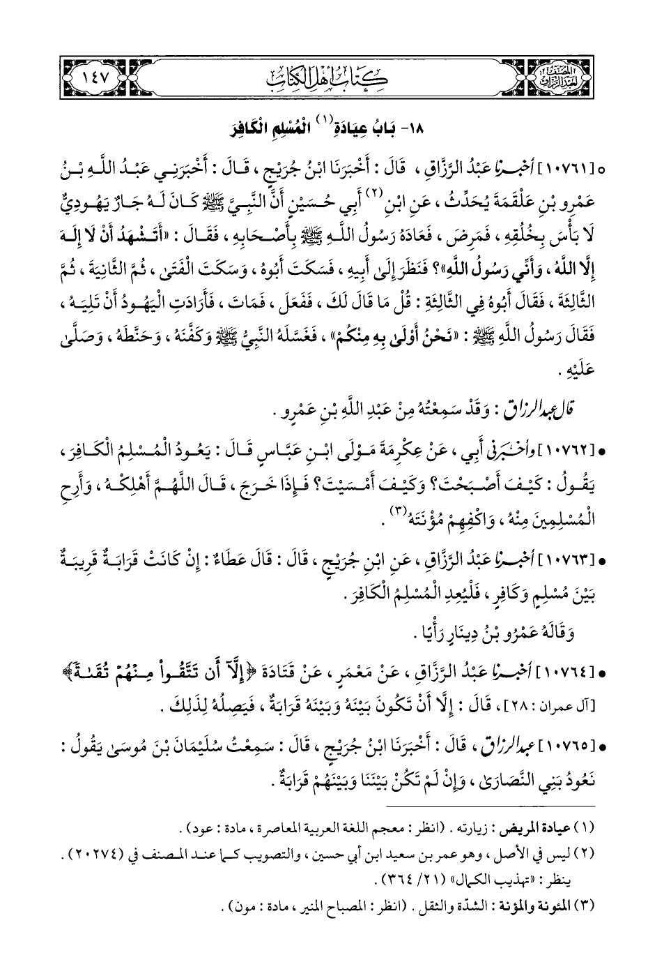 • [١٠٧٦٢] وأخبرنى أَبِي، عَنْ عِكْرِمَةَ مَوْلَى ابْنِ عَبَّاسٍ قَالَ: يَعُودُ الْمُسْلِمُ الْكَافِرَ، يَقُولُ: كَيْفَ أَصْبَحْتَ؟ وَكَيْفَ أَمْسَيْتَ؟ فَإِذَا خَرَجَ، قَالَ اللَّهُمَّ أَهْلِكْه، وَأَرِح الْمُسْلِمِينَ مِنْه، وَاكْفِهِمْ مُؤْنَتَهُ (¬٣).