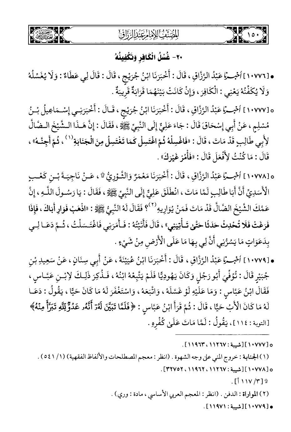 • [١٠٧٧٦] أخبرنا عَبْدُ الرَّزَّاقِ، قَالَ: أَخْبَرَنَا ابْنُ جُرَيْجٍ، قَالَ: قَالَ لِي عَطَاءٌ: وَلَا يُغَسِّلُهُ وَلَا يُكَفِّنُهُ يَعْنِي: الْكَافِرَ، وإِنْ كَانَتْ بَيْنَهُمَا قَرَابَةٌ قَرِيبَةٌ.