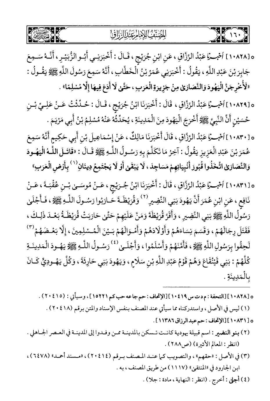 ° [١٠٨٣١] أخبرنا عَبْدُ الرَّزَّاقِ، قَالَ: أَخْبَرَنَا ابْنُ جُرَيْجٍ، عَنْ مُوسَى بْنِ عُقْبَةَ، عَنْ نَافِعٍ، عَنِ ابْنِ عُمَرَ أَنَّ يَهُودَ بَنِي النَّضِيرِ (¬٢) وَقُرَيْظَةَ حَارَبُوا رَسُولَ اللهِ - صلى الله عليه وسلم -، فَأَجْلَى رَسُولُ اللَّهِ - صلى الله عليه وسلم - بَنِي النَّضِيرِ، وَأَقَرَّ قُرَيْظَةَ وَمَن عَلَيْهِمْ حَتَّى حَارَبَتْ قُرَيْظَةُ بَعْدَ ذَلِكَ، فَقَتَلَ رِجَالَهُمْ، وَقَسَمَ نِسَاءَهُمْ وَأَوْلَادَهُمْ وَأَمْوَالَهُمْ بَيْنَ الْمُسْلِمِينَ، إِلَّا بَعْضَهُمْ (¬٣) لَحِقُوا بِرَسُولِ اللهِ - صلى الله عليه وسلم -، فَأَمَّنَهُمْ وَأَسْلَمُوا، وَأَجْلَى (¬٤) رَسُولُ اللَّهِ - صلى الله عليه وسلم - يَهُودَ الْمَدِينَةِ كُلَّهُمْ: بَنِي قَيْنُقَاعَ وَهُمْ قَوْمُ عَبْدِ اللَّهِ بْنِ سَلَامٍ، وَيَهُودَ بَنِي حَارِثَةَ، وَكُلَّ يَهُودِيٍّ كَانَ بِالْمَدِينَةِ.