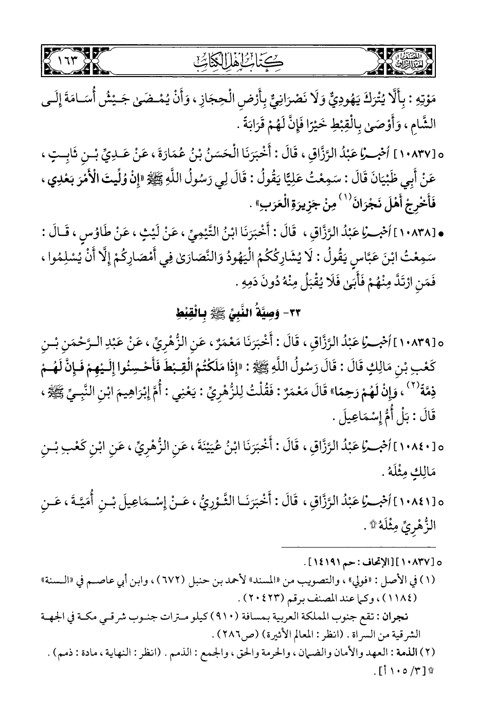 ° [١٠٨٣٧] أخبرنا عَبْدُ الرَّزَّاقِ، قَالَ: أَخْبَرَنَا الْحَسَنُ بْنُ عُمَارَةَ، عَنْ عَدِيِّ بْنِ ثَابِتٍ، عَنْ أَبِي ظَبْيَانَ قَالَ: سَمِعْتُ عَلِيًّا يَقُولُ: قَالَ لِي رَسُولُ اللهِ - صلى الله عليه وسلم - "إِنْ وُلِّيتَ الْأَمْرَ بَعْدِي، فَأَخْرِجْ أَهْلَ نَجْرَانَ (¬١) مِنْ جَزِيرَةِ الْعَرَبِ".