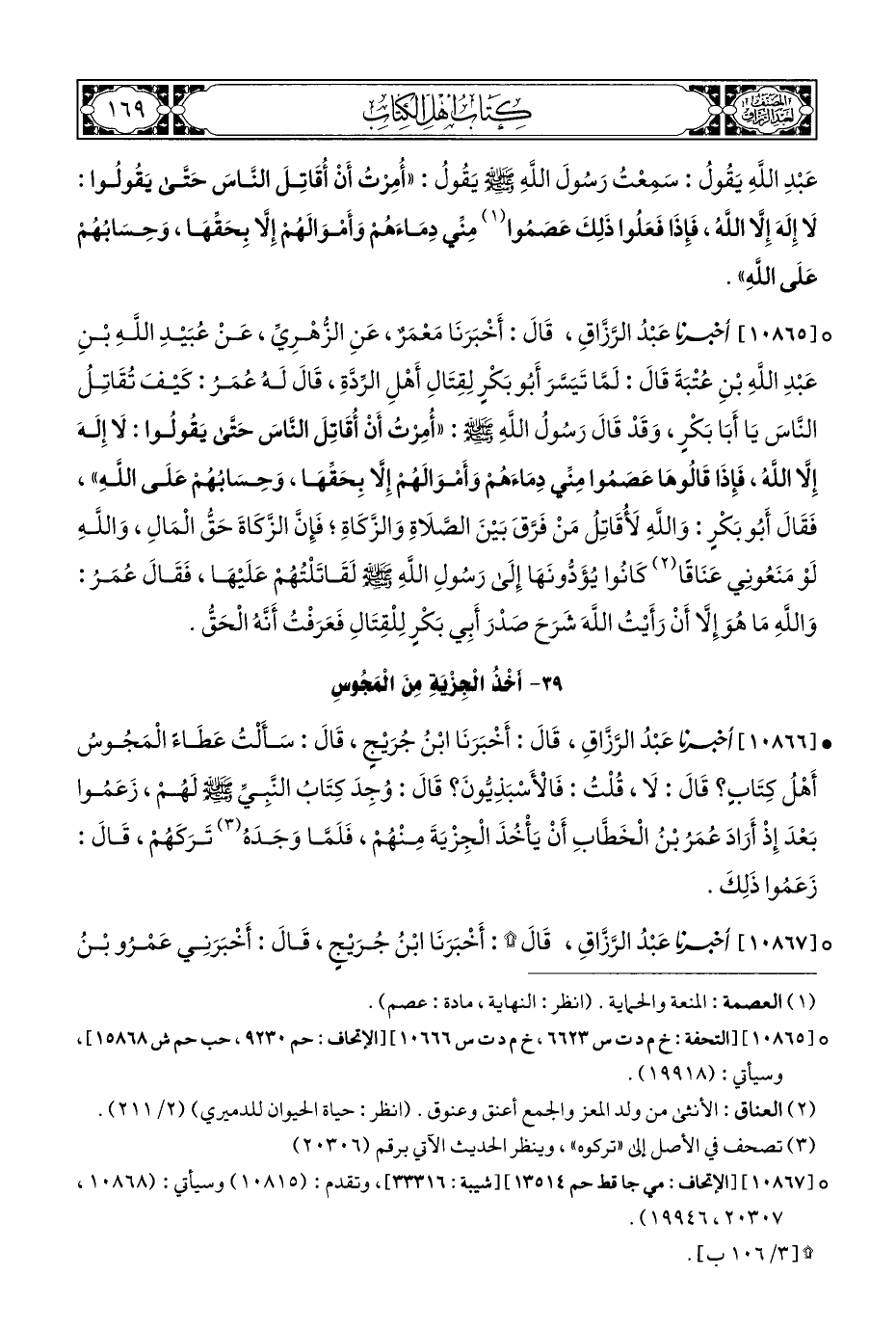 • [١٠٨٦٦] أخبرنا عَبْدُ الرَّزَّاقِ، قَالَ: أَخْبَرَنَا ابْنُ جُرَيْجٍ، قَالَ: سَأَلْتُ عَطَاءً الْمَجُوسُ أَهْلُ كِتَابٍ؟ قَالَ: لَا، قُلْتُ: فَالْأَسْبَذِنيُّونَ؟ قَالَ: وُجِدَ كِتَابُ النَّبِيِّ - صلى الله عليه وسلم - لَهُمْ، زَعَمُوا بَعْدَ إِذْ أَرَادَ عُمَرُ بْنُ الْخَطَّابِ أَنْ يَأْخُذَ الْجِزْيَةَ مِنْهُمْ، فَلَمَّا وَجَدَهُ (¬٣) تَرَكَهُمْ، قَالَ: زَعَمُوا ذَلِكَ.