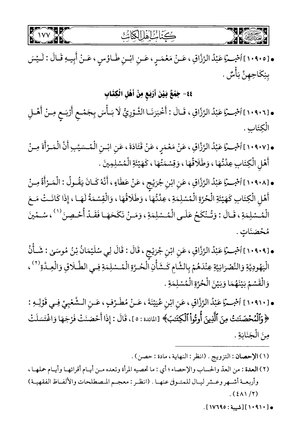 • [١٠٩٠٦] أخبرنا عَبْدُ الرَّزَّاقِ، قَالَ: أَخْبَرَنَا الثَّوْرِيُّ لَا بَأْسَ بِجَمْعِ أَرْبَعٍ مِنْ أَهْلِ الْكِتَابِ.