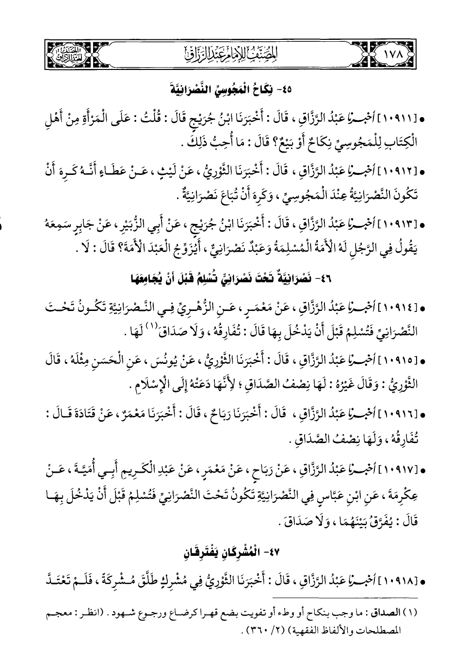 • [١٠٩١١] أخبرنا عَبْدُ الرَّزَّاقِ، قَالَ: أَخْبَرَنَا ابْنُ جُرَيْجٍ قَالَ: قُلْتُ: عَلَى الْمَرْأَةِ مِنْ أَهْلِ الْكِتَابِ لِلْمَجُوسِيِّ نِكَاحٌ أَوْ بَيْعٌ؟ قَالَ: مَا أُحِبُّ ذَلِكَ.
