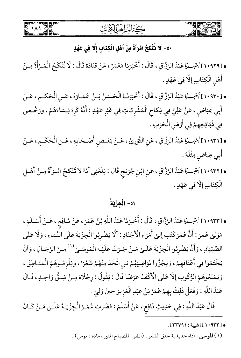 • [١٠٩٣٣] أخبرنا عَبْدُ الرَّزَّاقِ، قَالَ: أَخْبَرَنَا عَبْدُ اللهِ بْنُ عُمَرَ، عَنْ نَافِعٍ، عَنْ أَسْلَمَ، مَوْلَى عُمَرَ: أَنَّ عُمَرَ كَتَبَ إِلَى أُمَرَاءِ الْأَجْنَادِ: أَلَّا يَضْرِبُوا الْجِزْيَةَ عَلَى النِّسَاءِ، وَلَا عَلَى الصِّبْيَانِ، وَأَنْ يَضرِبُوا الْجِزْيَةَ عَلَى مَنْ جَرَتْ عَلَيْهِ الْمُوسَى (¬١) مِنَ الرِّجَالِ، وَأَنْ يُخْتَمُوا فِي أَعْنَاقِهِمْ، وَيَجُزُّوا نَوَاصِيَهُمْ مَنِ اتَّخَذَ مِنْهُمْ شَعْرًا، وَيُلْزِمُوهُمُ الْمَنَاطِقَ، وَيَمْنَعُوهُمُ الرُّكُوبَ إِلَّا عَلَى الْأَكُفِّ عَرْضًا قَالَ: يَقُولُ: رِجْلَاهُ مِنْ شِقٍّ وَاحِدٍ، قَالَ عَبْدُ اللهِ: وَفَعَلَ ذَلِكَ بِهِمْ عُمَرُ بْنُ عَبْدِ الْعَزِيزِ حِينَ وَلِيَ.