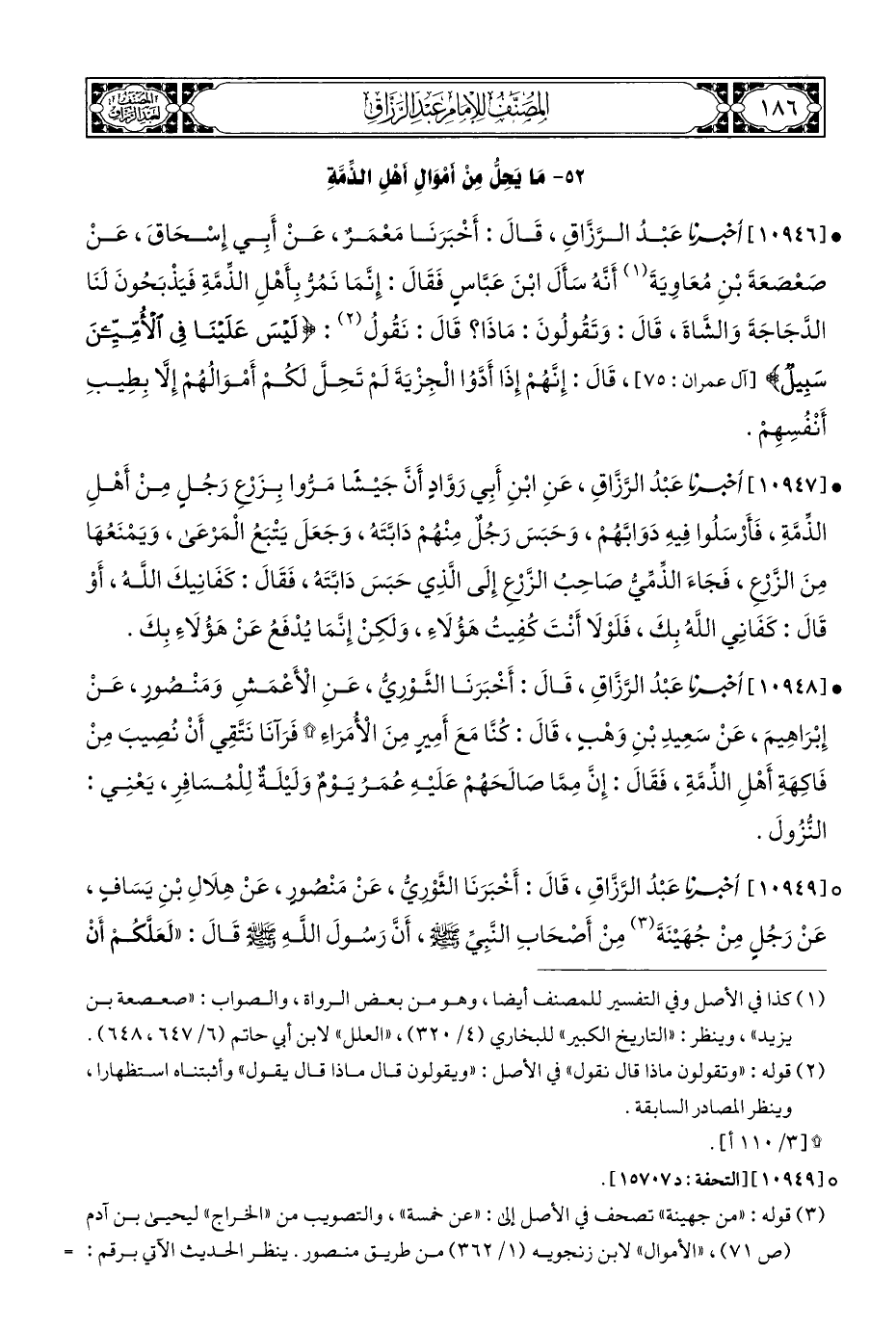 • [١٠٩٤٦] أخبرنا عَبْدُ الرَّزَّاقِ، قَالَ: أَخْبَرَنَا مَعْمَرٌ، عَنْ أَبِي إِسْحَاقَ، عَنْ صعْصَعَةَ بْنِ مُعَاوِيَةَ (¬١) أَنَّهُ سَأَلَ ابْنَ عَبَّاسٍ فَقَالَ: إِنَّمَا نَمُرُّ بِأَهْلِ الذِّمَّةِ فَيَذْبَحُونَ لَنَا الدَّجَاجَةَ وَالشَّاةَ، قَالَ: وَتَقُولُونَ: مَاذَا؟ قَالَ: نَقُولُ (¬٢): {لَيْسَ عَلَيْنَا فِي الْأُمِّيِّينَ سَبِيلٌ} [آل عمران: ٧٥]، قَالَ: إِنَّهُمْ إِذَا أَدَّوُا الْجِزْيَةَ لَمْ تَحِلَّ لكُمْ أَمْوَالُهُمْ إِلَّا بِطِيبِ أَنْفُسِهِمْ.