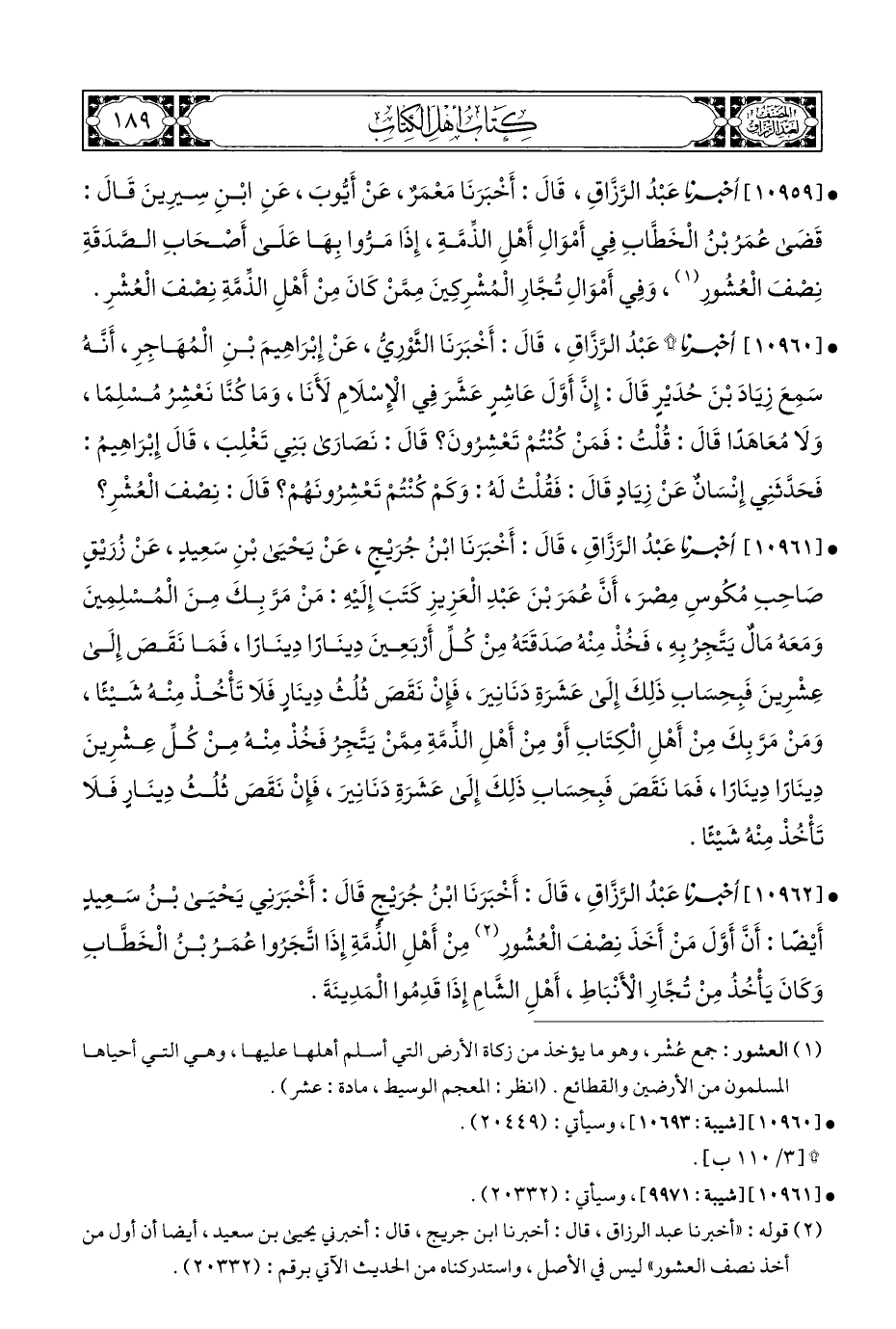 • [١٠٩٥٩] أخبرنا عَبْدُ الرَّزَّاقِ، قَالَ: أَخْبَرَنَا مَعْمَرٌ، عَنْ أَيُّوبَ، عَنِ ابْنِ سِيرِينَ قَالَ: قضَى عُمَرُ بْنُ الْخَطَّابِ فِي أَمْوَالِ أَهْلِ الذِّمَّةِ، إِذَا مَرُّوا بِهَا عَلَى أَصْحَابِ الصَّدَقَةِ نِضْفَ الْعُشُورِ (¬١)، وَفِي أَمْوَالِ تُجَّارِ الْمُشْرِكِينَ مِمَّنْ كَانَ مِنْ أَهْلِ الذِّمَّةِ نِصْفَ الْعُشْرِ.