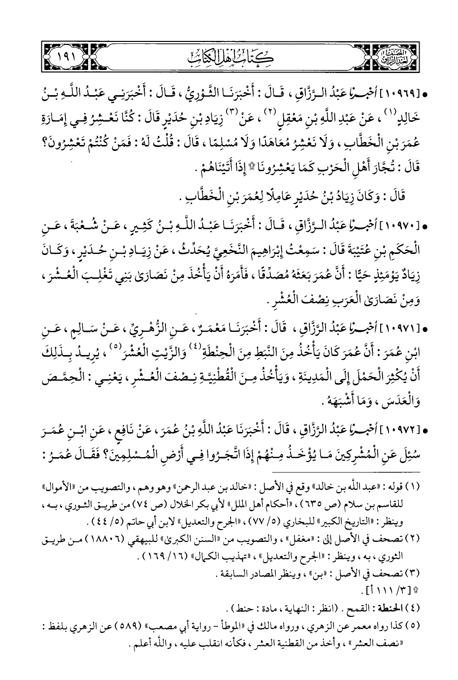 • [١٠٩٦٩] أخبرنا عَبْدُ الرَّزَّاقِ، قَالَ: أَخْبَرَنَا الثَّوْريُّ، قَالَ: أَخْبَرَنِي عَبْدُ اللهِ بْنُ خَالِدٍ (¬١)، عَنْ عَبْدِ اللهِ بْنِ مَعْقِلٍ (¬٢)، عَنْ (¬٣) زِيَادِ بْنِ حُدَيْرٍ قَالَ: كُنَّا نَعْشِرُ فِي إِمَارَةِ عُمَرَ بْنِ الْخَطَّابِ، وَلَا نَعْشِرُ مُعَاهَدًا وَلَا مُسْلِمًا، قَالَ: قُلْتُ لَهُ: فَمَن كُنْتُمْ تَعْشِرُونَ؟ قَالَ: تُجَّارَ أَهْلِ الْحَرْبِ كَمَا يَعْشِرُونَا (*) إِذَا أَتَيْنَاهُمْ.