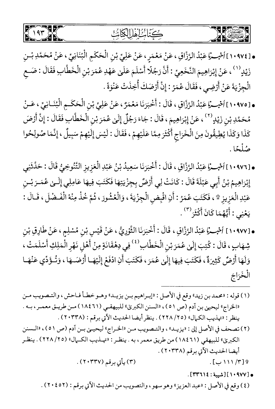 (¬٢) تصحف في الأصل إلى: "يزيد"، والتصويب من "الخراج" ليحيى بن آدم (ص ٥١)، "السنن الكبرى" للبيهقي (١٨٤٦١) من طريق معمر، به. ينظر: "تهذيب الكمال" (٢٥/ ٢٢٨). ينظر أيضا الحديث الآتي برقم (٢٠٣٣٨).