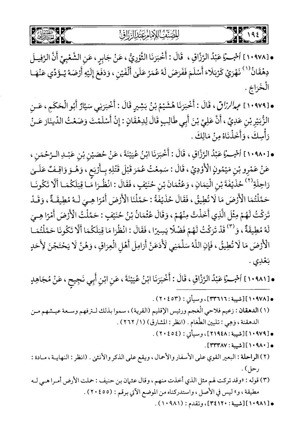 • [١٠٩٧٨] أخبرنا عَبْدُ الرَّزَّاقِ، قَالَ: أَخْبَرَنَا الثَّوْرِيُّ، عَنْ جَابِرِ، عَنِ الشَّعْبِيِّ أَنَّ الرَّفِيلَ دِهْقَانُ (¬١) نَهْرَيْ كَرْبَلَاءَ أَسْلَمَ فَفَرَضَ لَهُ عُمَرُ عَلَى أَلْفَيْنِ، وَدَفَعَ إِلَيْهِ أَرْضهُ يُؤَدِّي عَنْهَا الْخَرَاجَ.