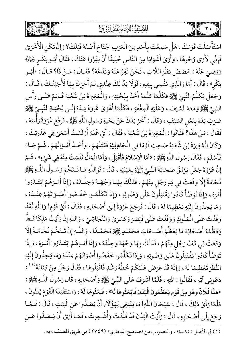 اسْتَأْصَلْتَ قَوْمَكَ، هَلْ سَمِعْتَ بِأَحَدٍ مِنَ الْعَرَبِ اجْتَاحَ أَصلَهُ قَبْلَكَ؟ وإِنْ تَكُنِ الْأُخْرَى فَإِنِّي لأَرَى وُجُوهًا، وَأَرَى أَشْوَابًا مِنَ النَّاسِ خَلِيقًا أَنْ يَفِرُّوا عَنْكَ، فَقَالَ أَبُو بَكْرٍ رحمهُ اللهُ وَرَضِيَ عَنْهُ: امْصصْ بَظْرَ اللَّاتِ، نَحْنُ نَفِرُّ عَنْهُ وَنَدَعُهُ؟ فَقَالَ: مَنْ ذَا؟ قَالَ: "أَبُو بَكْرٍ"، قَالَ: أَمَا وَالَّذِي نَفْسِي بِيَدِهِ، لَوْلَا يَدٌ لَكَ عِنْدِي لَمْ أَخزِكَ بِهَا لأَجَبْتُكَ، قَالَ: وَجَعَلَ يُكَلِّمُ النَّبِيَّ - صلى الله عليه وسلم - فَكُلَّمَا كَلَّمَهُ أَخَذَ بِلِحْيَتِهِ، وَالْمُغِيرَةُ بْنُ شُعْبَةَ قَائِمٌ عَلَى رَأْسِ النَّبِيِّ - صلى الله عليه وسلم - ومَعَهُ السَّيْفُ، وَعَلَيْهِ الْمِغْفَرُ، فَكُلَّمَا أَهْوَى عُرْوَةُ يَدَهُ إِلَى لِحْيَةِ النَّبِيِّ - صلى الله عليه وسلم - ضَرَبَ يَدَهُ بِنَعْلِ السَّيْفِ، وَقَالَ: أَخِّرْ يَدَكَ عَنْ لِحْيَةِ رَسولِ اللهِ - صلى الله عليه وسلم -، فَرَفَعَ عُرْوَةُ رَأسَهُ، فَقَالَ: مَنْ هَذَا؟ فَقَالُوا: الْمُغِيرَةُ بْنُ شُعْبَةَ، فَقَالَ: أَيْ غُدَرُ أَوَلَسْتُ أَسْعَى فِي غَدْرَتِكَ، وَكَانَ الْمُغِيرَةُ بْنُ شُعْبَةَ صَحِبَ قَوْمَا فِي الْجَاهِلِيَّةِ فَقَتَلَهُمْ، وَأَخَذَ أَمْوَالَهُمْ، ثُمَّ جَاءَ فَأَسْلَمَ، فَقَالَ رَسُولُ اللهِ - صلى الله عليه وسلم -: "أَمَّا الْإِسْلَامُ فَأَقْبَلُ، وَأَمَّا الْمَالُ فَلَسْتُ مِنْهُ في شَيْءٍ"، ثُمَّ إِنَّ عُرْوَةَ جَعَلَ يَرْمُقُ صحَابَةَ النَّبِيِّ - صلى الله عليه وسلم - بِعَيْنَيْهِ، قَالَ: فَوَاللهِ مَا تَنَخَّمَ رَسُولُ اللهِ - صلى الله عليه وسلم - نُخَامَةً إِلَّا وَقَعَتْ فِي يَدِ رَجُلٍ مِنْهُمْ، فَدَلَكَ بِهَا وَجْهَهُ وَجِلْدَهُ، وإِذَا أَمَرَهُمُ ابْتَدَرُوا أَمْرَهُ، وَإِذَا تَوَضَّأَ كَادُوا يَقْتَتِلُونَ عَلَى وَضوئِهِ، وإِذَا تَكَلَّمُوا خَفَضُوا أَصوَاتَهُمْ عِنْدَهُ، وَمَا يُحِدُّونَ إِلَيْهِ تَعْظِيمًا لَهُ، قَالَ: فَرَجَعَ عُرْوَةُ إِلَى أَصْحَابِهِ، فَقَالَ: أَيْ قَوْمِ! وَاللهِ لَقَدْ وَفَدْتُ عَلَى الْمُلُوكِ وَوَفَدْتُ عَلَى قَيْصَرَ وَكِسْرَى وَالنَّجَاشِيِّ، وَاللهِ إِنْ رَأَيْتُ مَلِكًا قَطُّ يُعَظِّمُهُ أَصْحَابُهُ مَا يُعَظِّمُ أَصحَابُ مُحَمَّدٍ - صلى الله عليه وسلم - مُحَمَّدًا، وَاللهِ إِنْ تَنَخَّمَ نُخَامَةَ إِلَّا وَقَعَتْ فِي كَفِّ رَجُلٍ مِنْهُمْ، فَدَلَكَ بِهَا وَجْهَهُ وَجِلْدَهُ، وإِذَا أَمَرَهُمُ ابْتَدَرُوا أَمْرَهُ، وإِذَا تَوَضَّأَ كَادُوا يَقْتَتِلُونَ عَلَى وَضُوئِهِ، وإِذَا تَكَلَّمُوا خَفَضُوا أَصْوَاتَهُمْ عِنْدَهُ وَمَا يُحِدُّونَ إِلَيْهِ النَّظَرَ تَعْظِيمًا لَهُ، وَإِنَّهُ قَدْ عَرَضَ عَلَيْكُمْ خُطَّةَ رُشْدٍ فَاقْبَلُوهَا، فَقَالَ رَجُلٌ مِنْ كِنَانَةَ (¬١): دَعُونِي آتِهِ، فَقَالُوا: ائْتِهِ، فَلَمَّا أَشْرَفَ عَلَى النَّبِيِّ - صلى الله عليه وسلم - وَأَصْحَابِهِ، قَالَ رَسُولُ اللهِ - صلى الله عليه وسلم -: "هَذَا فُلَانٌ وَهُوَ مِنْ قَوْمٍ يُعَظِّمُونَ الْبُدْنَ فَابْعَثُوهَا لَهُ"، فَبَعَثُوهَا لَهُ، وَاسْتَقْبَلَهُ الْقَوْمُ يُلَبُّونَ، فَلَمَّا رَأَى ذَلِكَ، قَالَ: سُبْحَانَ اللهِ! مَا يَنْبَغِي لِهَؤُلَاءِ أَنْ يُصَدُّوا عَنِ الْبَيْتِ، قَالَ: فَلَمَّا رَجَعَ إِلَلى أَصْحَابِهِ، قَالَ: رَأَيْتُ الْبُدْنَ قَدْ قُلِّدَتْ وَأُشْعِرَتْ، فَمَا أَرَى أَنْ يُصَدُّوا عَنِ