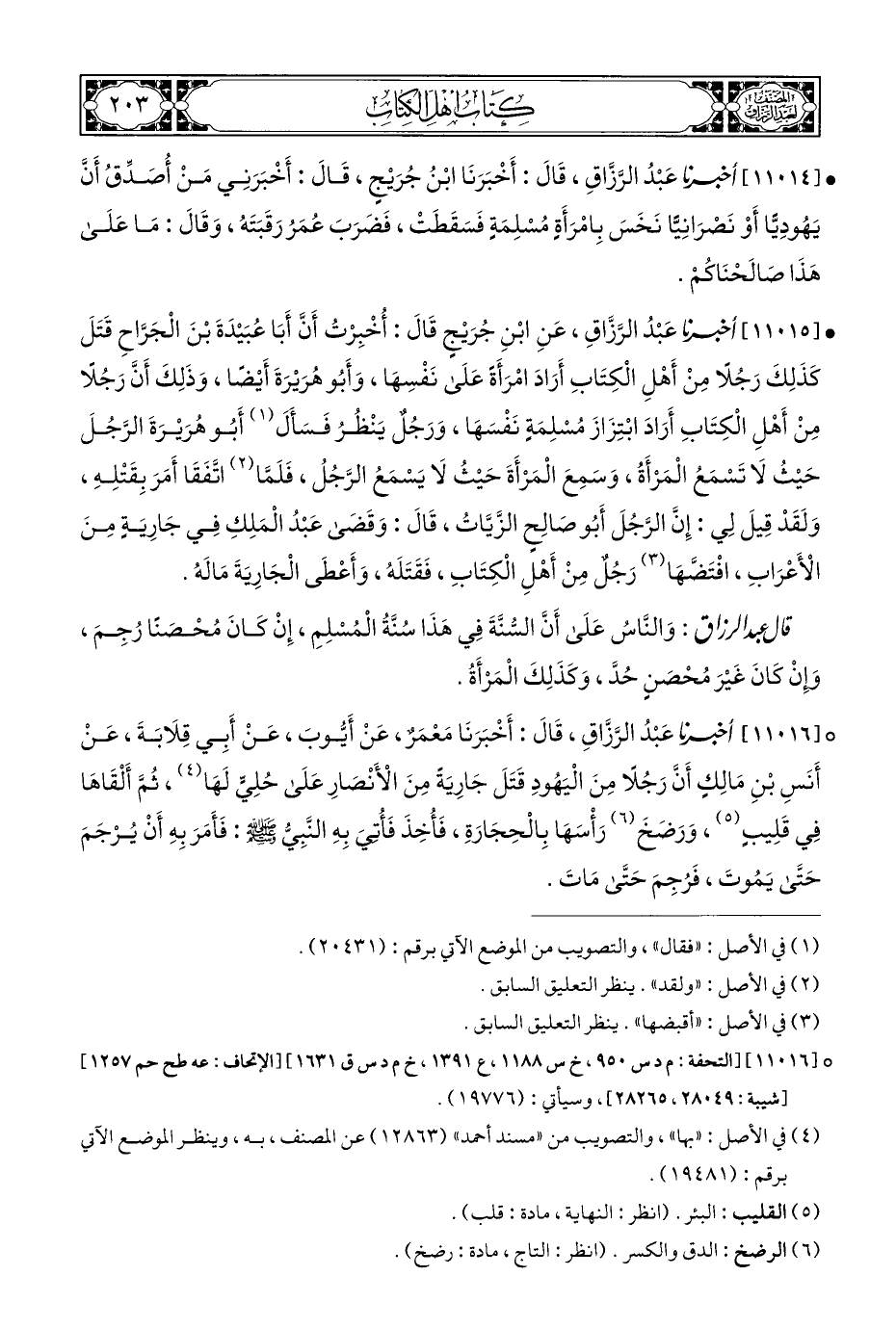 • [١١٠١٥] أخبرنا عَبْدُ الرَّزَّاقِ، عَنِ ابْنِ جُرَيْجٍ قَالَ: أُخْبِزتُ أَنَّ أَبَا عُبَيْدَةَ بْنَ الْجَرَّاحِ قَتَلَ كَذَلِكَ رَجُلًا مِنْ أَهْلِ الْكِتَابِ أَرَادَ امْرَأَةً عَلَى نَفْسِهَا، وَأَبُو هُرَيْرَةَ أَيْضًا، وَذَلِكَ أَنَّ رَجُلًا مِنْ أَهْلِ الْكِتَابِ أَرَادَ ابْتِزَازَ مُسْلِمَةٍ نَفْسَهَا، وَرَجُلٌ يَنْظُرُ فَسَأَلَ (¬١) أَبُو هُرَيْرَةَ الرَّجُلَ حَيْثُ لَا تَسْمَعُ الْمَرْأَةُ، وَسَمِعَ الْمَرْأَةَ حَيْثُ لَا يَسْمَعُ الرَّجُلُ، فَلَمَّا (¬٢) اتَّفَقَا أَمَرَ بِقَتْلِهِ، وَلَقَدْ قِيلَ لِي: إِنَّ الرَّجُلَ أَبُو صَالِحٍ الزَّيَّاتُ، قَالَ: وَقَضَى عَبْدُ الْمَلِكِ فِي جَارِيَةٍ مِنَ الْأَعْرَابِ، افْتَضَّهَا (¬٣) رَجُلٌ مِنْ أَهْلِ الْكِتَابِ، فَقَتَلَهُ، وَأَعْطَى الْجَارِيَةَ مَالَهُ.