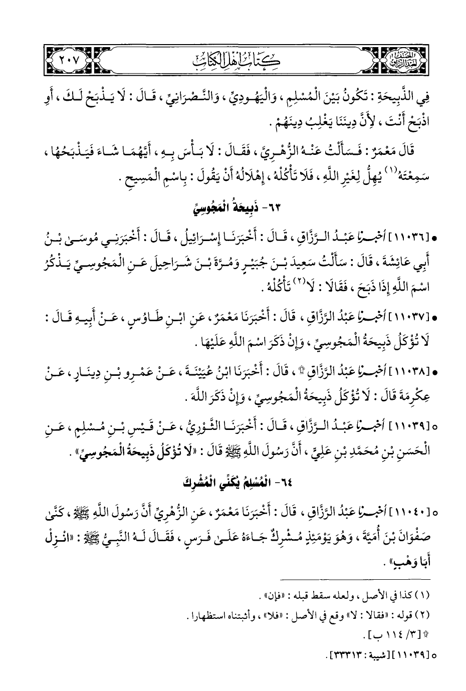 ° [١١٠٣٩] أخبرنا عَبْدُ الرَّزَّاقِ، قَالَ: أَخْبَرَنَا الثَّوْرِيُّ، عَنْ قَيْسِ بْنِ مُسْلِمٍ، عَنِ الْحَسَنِ بْنِ مُحَمَّدِ بْنِ عَلِيٍّ، أَنَّ رَسُولَ اللهِ - صلى الله عليه وسلم - قَالَ: "لَا تُؤْكَلُ ذَبِيحَةُ الْمَجُوسِيِّ".