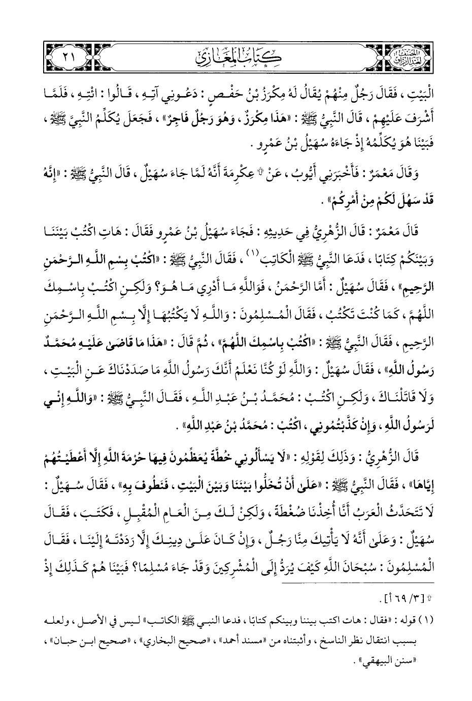 (¬١) قوله: "فقال: هات اكتب بيننا وبينكم كتابًا، فدعا النبي - صلى الله عليه وسلم - الكاتب" ليس في الأصل، ولعله بسبب انتقال نظر الناسخ، وأثبتناه من "مسند أحمد"، "صحيح البخاري"، "صحيح ابن حبان"، "سنن البيهقي".