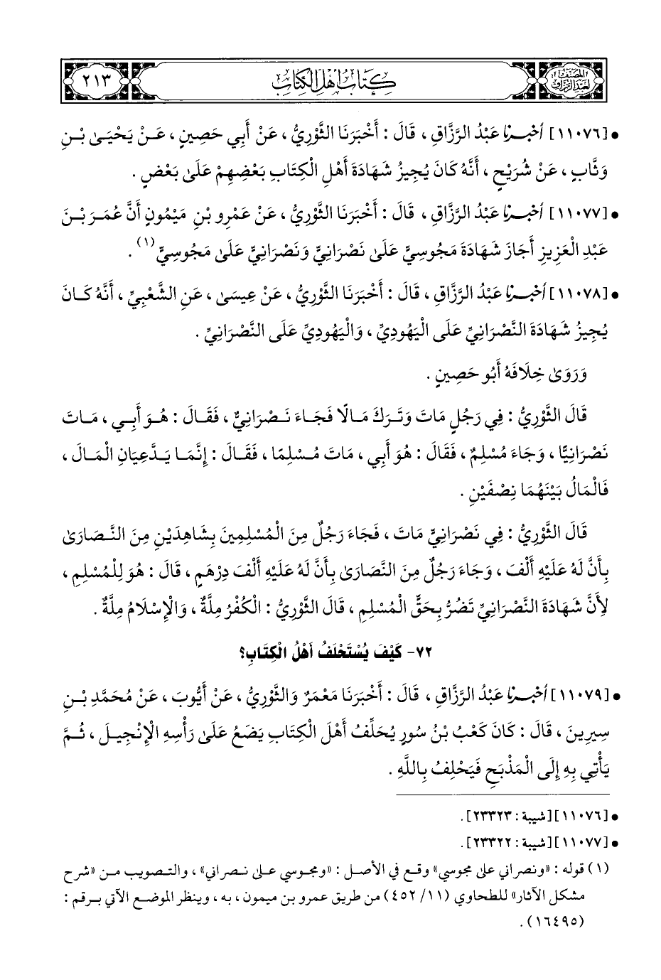 • [١١٠٧٨] أخبرنا عَبْدُ الرَّزَّاقِ، قَالَ: أَخْبَرَنَا الثَّوْرِيُّ، عَنْ عِيسَي، عَنِ الشَّعْبِيِّ، أَنَّهُ كَانَ يُجِيزُ شَهَادَةَ النَّصْرَانِيِّ عَلَى الْيَهُودِيِّ، وَالْيَهُودِيِّ عَلَى النَّصْرَانِيِّ.