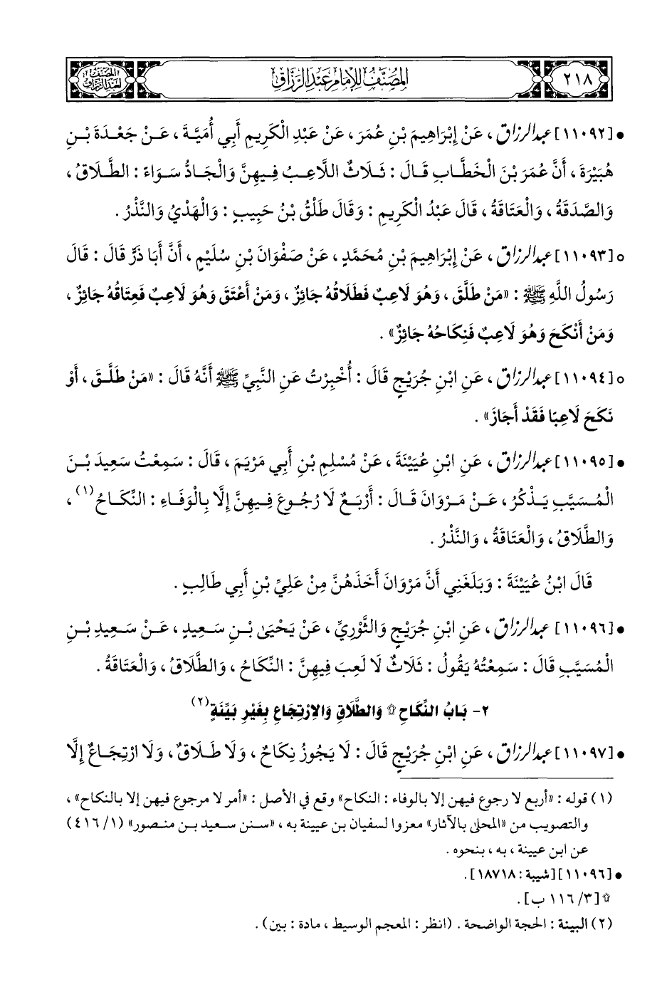 ° [١١٠٩٤] عبد الرزاق، عَنِ ابْنِ جُرَيْجٍ قَالَ: أُخْبِرْتُ عَنِ النَّبِيِّ - صلى الله عليه وسلم - أَنَّهُ قَالَ: "مَنْ طَلَّقَ، أَوْ نَكَحَ لَاعِبًا فَقَدْ أَجَازَ".
