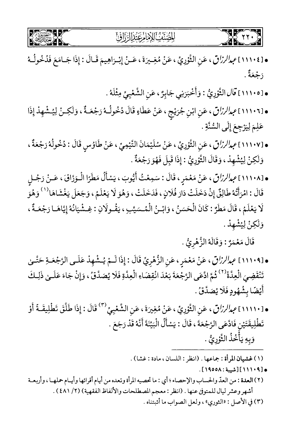 • [١١١١٠] عبد الرزاق، عَنِ الثَّوْرِيِّ، عَنْ مُغِيرَةَ، عَنِ الشَّعْبِيِّ (¬٣) قَالَ: إِذَا طَلَّقَ تَطْلِيقَةً أَوْ تَطْلِيقَتَيْنِ فَادَّعَى الرَّجْعَةَ، قَالَ: يَسْأَلُ الْبَيِّنَةَ أَنَّهُ قَدْ رَجَعَ.