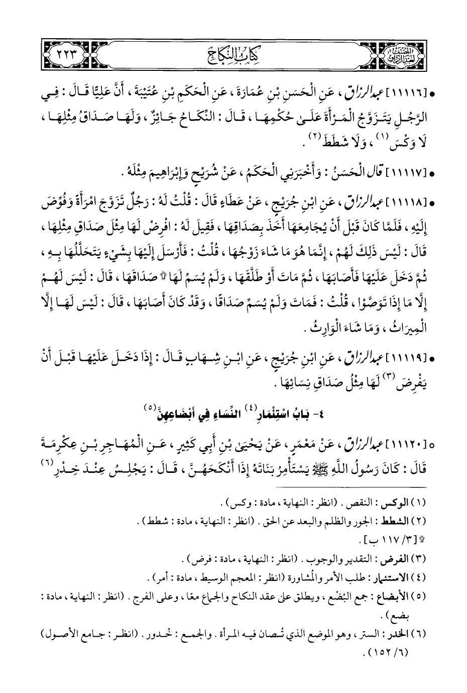 ° [١١١٢٠] عبد الرزاق، عَنْ مَعْمَرٍ، عَنْ يَحْيَى بْنِ أَبِي كَثِيرٍ، عَنِ الْمُهَاجِرِ بْنِ عِكْرِمَةَ قَالَ: كَانَ رَسُولُ اللهِ - صلى الله عليه وسلم - يَسْتَأْمِرُ بَنَاتَهُ إِذَا أَنْكَحَهُنَّ، قَالَ: يَجْلِسُ عِنْدَ خِدْرِ (¬٦)