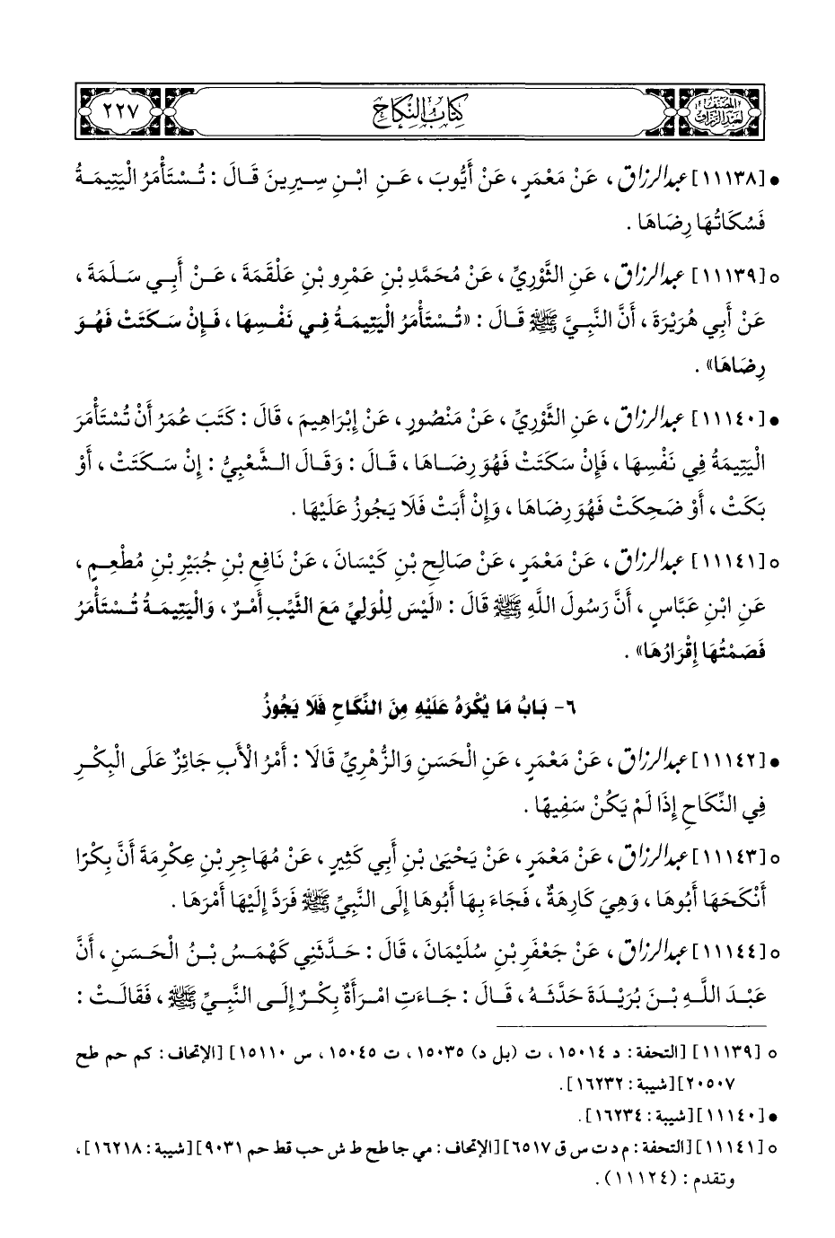 ° [١١١٤١] عبد الرزاق، عَنْ مَعْمَرٍ، عَنْ صَالِحِ بْنِ كَيْسَانَ، عَنْ نَافِعِ بْنِ جُبَيْرِ بْنِ مُطْعِمٍ، عَنِ ابْنِ عَبَّاسٍ، أَنَّ رَسُولَ اللهِ - صلى الله عليه وسلم - قَالَ: "لَيْسَ لِلْوَلِيِّ مَعَ الثَّيِّبِ أَمْرٌ، وَالْيَتِيمَةُ تُسْتَأْمَرُ فَصَمْتُهَا إِقْرَارُهَا".