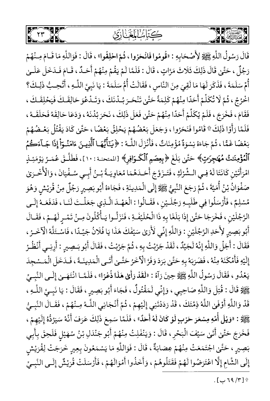 قَالَ رَسُولُ اللهِ - صلى الله عليه وسلم - لِأَصحَابِهِ: "قُومُوا فَانْحَرُوا، ثُمَّ احْلِقُوا"، قَالَ: فَوَاللهِ مَا قَامَ مِنْهُمْ رَجُلٌ، حَتَّى قَالَ ذَلِكَ ثَلَاثَ مَرَّاتٍ، قَالَ: فَلَمَّا لَمْ يَقُمْ مِنْهُمْ أَحَدٌ، قَامَ فَدَخَلَ عَلَى أُمِّ سَلَمَةَ، فَذَكَرَ لَهَا مَا لَقِيَ مِنَ النَّاسِ، فَقَالَتْ أُمُّ سَلَمَةَ: يَا نَبِيَّ اللهِ، أَتُحِبُّ ذَلِكَ؟ اخْرُجْ، ثُمَّ لَا تُكَلِّمْ أَحَدًا مِنْهُمْ كَلِمَةً حَتَّى تَنْحَرَ بُدْنَكَ، وَتَدْعُوَ حَالِقَكَ فَيَحْلِقَكَ، فَقَامَ، فَخَرَجَ، فَلَمْ يُكَلِّمْ أَحَدًا مِنْهُمْا حَتَّى فَعَلَ ذَلِكَ، نَحَرَ بُدْنَهُ، وَدَعَا حَالِقَهُ فَحَلَقَهُ، فَلَمَّا رَأَوْا ذَلِكَ (*) قَامُوا فَنَحَرُوا، وَجَعَلَ بَعْضُهُمْ يَحْلِقُ بَعْضًا، حَتَّى كَادَ يَقْتُلُ بَعْضُهُمْ بَعْضًا غَمًّا، ثُمَّ جَاءَهُ نِسْوَةٌ مُؤْمِنَاتٌ، فَأَنْزَلَ اللهُ: {يَاأَيُّهَا الَّذِينَ آمَنُوا إِذَا جَاءَكُمُ الْمُؤْمِنَاتُ مُهَاجِرَاتٍ} حَتَّى بَلَغَ {بِعِصَمِ الْكَوَافِرِ} [الممتحنة: ١٠]، فَطَلَّقَ عُمَرُ يَوْمَئِذٍ امْرَأَتَيْنِ كَانَتَا لَهُ فِي الشِّرْكِ، فَتَزَوَّجَ أَحَدَهُمَا مُعَاوِيَةُ بْنُ أَبِي سُفْيَانَ، وَالْأُخْرَى صَفْوَانُ بْنُ أُمَيَّةَ، ثُمَّ رَجَعَ النَّبِيُّ - صلى الله عليه وسلم - إلَى الْمَدِينَةِ، فَجَاءَهُ أَبُو بَصِيرٍ رَجُلٌ مِنْ قُرَيْشٍ وَهُوَ مُسْلِمٌ، فَأَرْسَلُوا فِي طَلَبِهِ رَجُلَيْنِ، فَقَالُوا: الْعَهْدَ الَّذِي جَعَلْتَ لَنَا، فَدَفَعَهُ إِلَى الرَّجُلَيْنِ، فَخَرَجَا حَتَّى إِذَا بَلَغَا بِهِ ذَا الْحُلَيْفَةِ، فَنَزَلُوا يَأْكُلُونَ مِنْ تَمْرٍ لَهُمْ، فَقَالَ أَبُو بَصِيرٍ لِأَحَدِ الرَّجُلَيْنِ: وَاللهِ إِنِّي لأَرَى سَيْفَكَ هَذَأ يَا فُلَانُ جَيِّدًا، فَاسْتَلَّهُ الْآخَرُ، فَقَالَ: أَجَلْ وَاللهِ إِنَّهُ لَجَيِّدٌ، لَقَدْ جَرَّبْتُ بِهِ، ثُمَّ جَرَّبْتُ، فَقَالَ أَبُو بَصِيرٍ: أَرِنِي أَنْظُرْ إِلَيْهِ فَأَمْكَنَهُ مِنْهُ، فَضَرَبَهُ بِهِ حَتَّى بَرَدَ وَفَرَّ الْآخَرُ حَتَّى أَتَى الْمَدِينَةَ، فَدَخَلَ الْمَسْجِدَ يَعْدُو، فَقَالَ رَسُولُ اللهِ - صلى الله عليه وسلم - حِينَ رَآهُ: "لَقَدْ رَأَى هَذَا ذُعْرًا"، فَلَمَّا انْتَهَى إِلَى النَّبِيِّ - صلى الله عليه وسلم - قَالَ: قُتِلَ وَاللهِ صَاحِبِي، وَإِنِّي لَمَقْتُولٌ، فَجَاءَ أَبُو بَصِيرٍ، فَقَالَ: يَا نَبِيَّ اللهِ، قَدْ وَاللهِ أَوْفَى اللهُ ذِمَّتَكَ، قَدْ رَدَدْتَنِي إِلَيْهِمْ، ثُمَّ أَنْجَانِي اللهُ مِنْهُمْ، فَقَالَ النَّبِيُّ - صلى الله عليه وسلم -: "وَيْلَ أُمِّهِ مِسْعَرَ حَرْبٍ لَوْ كَانَ لَهُ أَحَدٌ"، فَلَمَّا سَمِعَ ذَلِكَ عَرَفَ أَنَّهُ سَيَرُدُّهُ إِلَيْهِمْ، فَخَرَجَ حَتَّى أَتَى سَيْفَ الْبَحْرِ، قَالَ: وَيَنْفَلِتُ مِنْهُمْ أَبُو جَنْدَلِ بْنُ سُهَيْلٍ فَلَحِقَ بِأَبِي بَصيرٍ، حَتَّى اجْتَمَعَتْ مِنْهُمْ عِصَابَةٌ، قَالَ: فَوَاللهِ مَا يَسْمَعُونَ بِعِيرٍ خَرَجَتْ لِقُرَيْشٍ إِلَى الشَّامِ إِلَّا اعْتَرَضُوا لَهُمْ فَقَتَلُوهُمْ، وَأَخَذُوا أَمْوَالَهُمْ، فَأَرْسَلَتْ قُرَيْشٌ إِلَى النَّبِيِّ