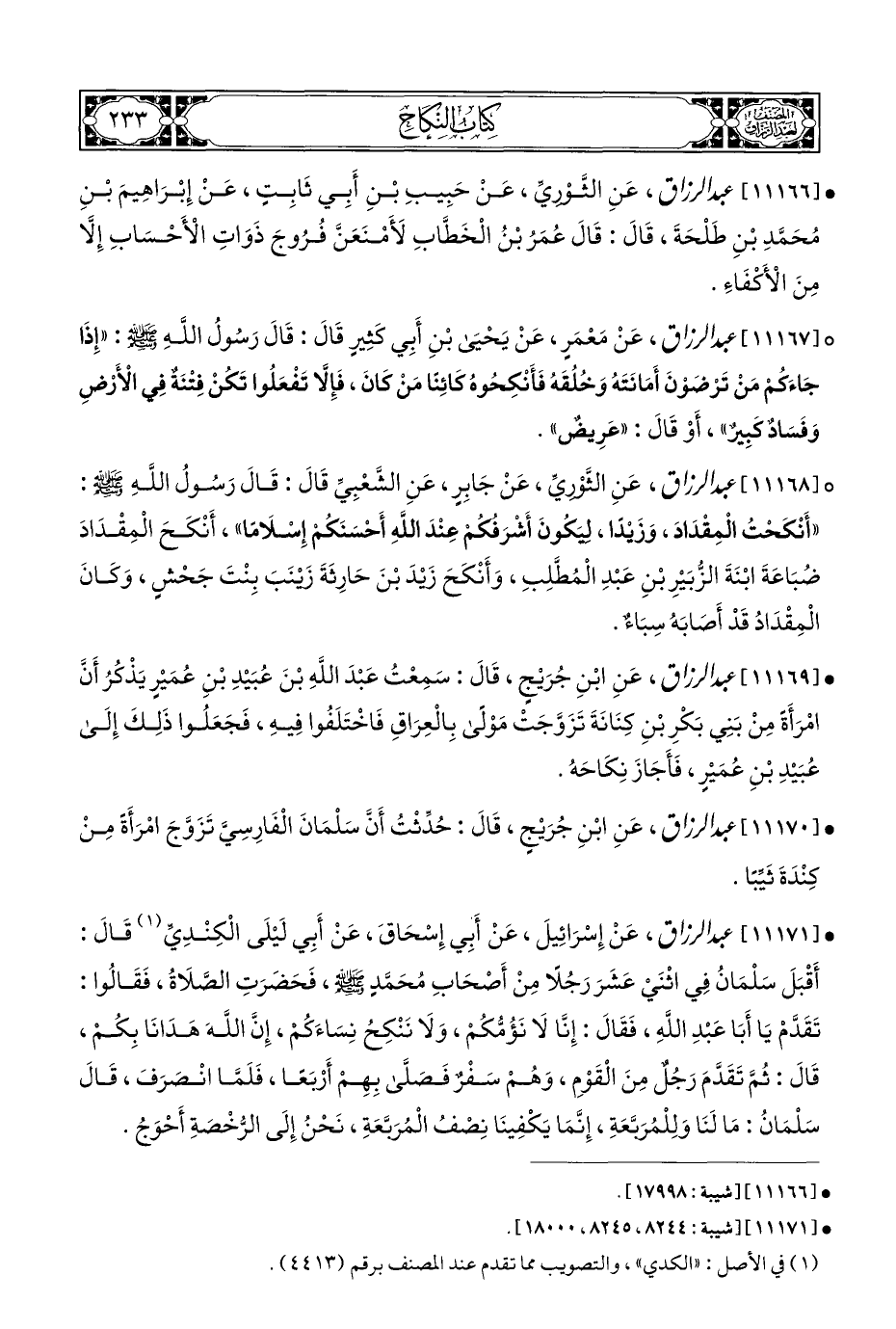 ° [١١١٦٨] عبد الرزاق، عَنِ الثَّوْرِيِّ، عَنْ جَابِرٍ، عَنِ الشَّعْبِيِّ قَالَ: قَالَ رَسُولُ اللهِ - صلى الله عليه وسلم -: "أَنْكَحْتُ الْمِقْدَادَ، وَزَيْدًا، ليَكُونَ أَشْرَفُكُمْ عِنْدَ اللهِ أَحْسَنَكُمْ إِسْلَامًا"، أَنْكَحَ الْمِقْدَادَ ضُبَاعَةَ ابْنَةَ الزُّبَيْرِ بْنِ عَبْدِ الْمُطَّلِبِ، وَأَنْكَحَ زَيْدَ بْنَ حَارِثَةَ زَيْنَبَ بِنْتَ جَحْشٍ، وَكَانَ الْمِقْدَادُ قَدْ أَصَابَهُ سِبَاءٌ.