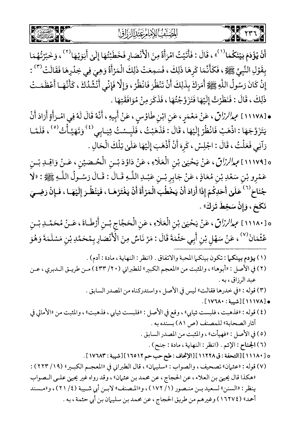 ° [١١١٧٩] عبد الرزاق، عَنْ يَحْيَى بْنِ الْعَلَاءِ، عَنْ دَاوُدَ بْنِ الْحُصَيْنِ، عَنْ وَاقِدِ بْنِ عَمْرِو بْنِ سَعْدِ بْنِ مُعَاذٍ، عَنْ جَابِرِ بْنِ عَبْدِ اللهِ قَالَ: قَالَ رَسُولُ اللهِ - صلى الله عليه وسلم -: "لَا جُنَاحَ (¬٦) عَلَى أَحَدِكُمْ إِذَا أَرَادَ أَنْ يَخْطُبَ الْمَرْأَةَ أَنْ يَغْتَرَّهَا، فَيَنْظُرَ إِلَيْهَا، فَإِنْ رَضِيَ نَكَحَ، وَإِنْ سَخِطَ تَرَكَ".