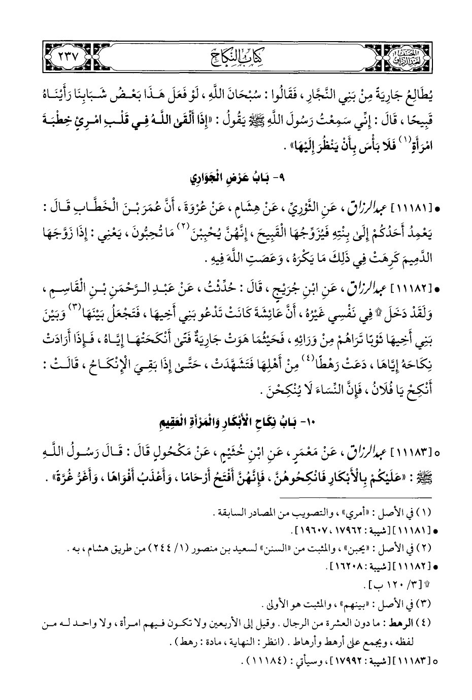 ° [١١١٨٣] عبد الرزاق، عَنْ مَعْمَرٍ، عَنِ ابْنِ خُثَيْمٍ، عَنْ مَكْحُولٍ قَالَ: قَالَ رَسُولُ اللهِ - صلى الله عليه وسلم -: "عَلَيْكُمْ بِالْأَبْكَارِ فَانْكِحُوهُنَّ، فَإِنَّهُنَّ أَفْتَحُ أَرْحَامًا، وَأَعْذَبُ أَفْوَاهًا، وَأَغَرُّ غُرَّةً".