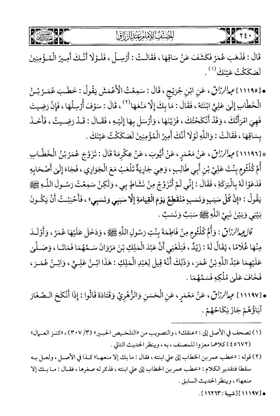 ° [١١١٩٦] عبد الرزاق، عَنْ مَعْمَرٍ، عَنْ أَيُّوبَ، عَنْ عِكْرِمَةَ قَالَ: تَزَوَّجَ عُمَرُ بْنُ الْخَطَّابِ أُمَّ كُلْثُومٍ بِنْتَ عَلِيِّ بْنِ أَبِي طَالِبٍ، وَهِيَ جَارِيَةٌ تَلْعَبُ مَعَ الْجَوَارِي، فَجَاءَ إِلَى أَصْحَابِهِ فَدَعَوْا لَهُ بِالْبَرَكَةِ، فَقَالَ: إِنِّي لَمْ أَتَزَوَّجْ مِنْ نَشَاطٍ بِي، وَلكنْ سَمِعْتُ رَسُولَ اللهِ - صلى الله عليه وسلم - يَقُولُ: "إِنَّ كُل سَبَبٍ وَنَسَبِ مُنْقَطِعٌ يَوْمَ الْقِيَامَةِ إِلَّا سَبَبِي وَنَسَبِي"، فَأَحْبَبْتُ أَنْ يَكُونَ بَيْنِي وَبَيْنَ نَبِي اللهِ - صلى الله عليه وسلم - سَبَبٌ وَنَسَبٌ.