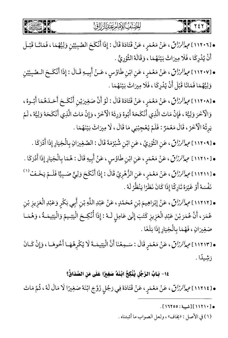• [١١٢١١] عبد الرزاق، عَنْ مَعْمَرٍ، عَنِ الزُّهْرِيِّ قَالَ: إِذَا أَنْكَحَ وَلِيٌّ صَبِيًّا فَلَمْ يَخَفْ (¬١) نَفْسَهُ أَوْ غَيْرَهُ تَارِكًا إِذَا كَانَ نَظَرًا يَنْظُرُ لَهُ.