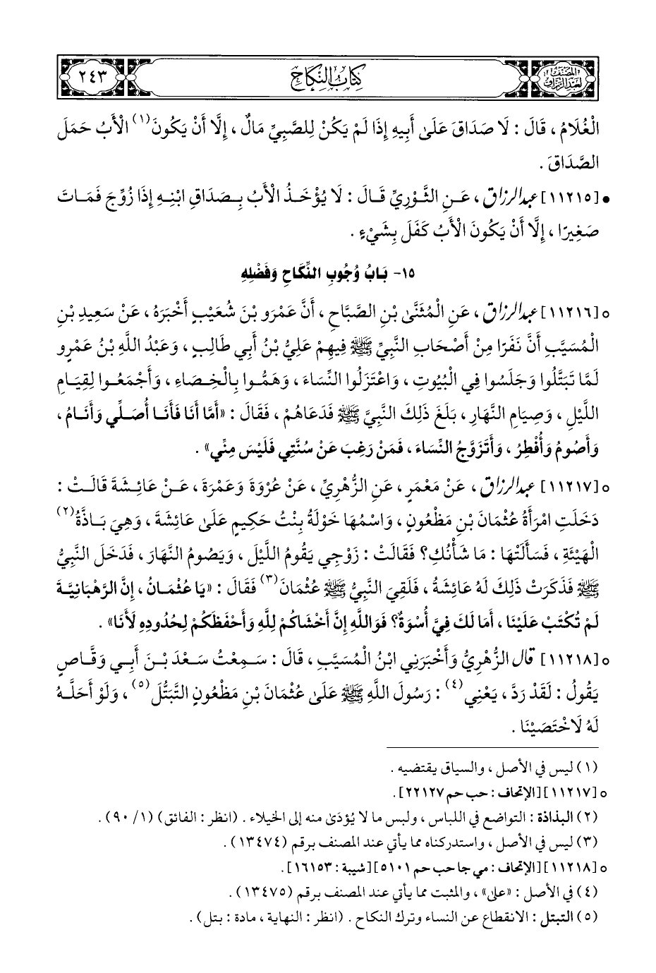 ° [١١٢١٨] قال الزُّهْرِيُّ وَأَخْبَرَنِي ابْنُ الْمُسَيَّبِ، قَالَ: سَمِعْتُ سَعْدَ بْنَ أَبِي وَقَّاصٍ يَقُولُ: لَقَدْ رَدَّ، يَعْنِي (¬٤): رَسُولَ اللهِ - صلى الله عليه وسلم - عَلَى عُثْمَانَ بْنِ مَظْعُونٍ التَّبَتُّلَ (¬٥)، وَلَوْ أَحَلَّهُ لَهُ لَاخْتَصَيْنَا.