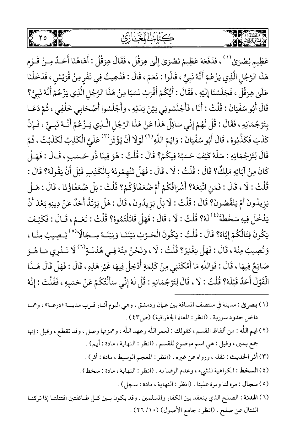 عَظِيمِ بُصْرَى (¬١)، فَدَفَعَهُ عَظِيمُ بُصْرَى إِلَى هِرَقْلَ، فَقَالَ هِرَقْلُ: أَهَاهُنَا أَحَدٌ مِنْ قَوْمِ هَذَا الرَّجُلِ الَّذِي يَزْعُمُ أَنَّهُ نَبِيٌّ، قَالُوا: نَعَمْ، قَالَ: فَدُعِيتُ فِي نَفَرٍ مِنْ قُرَيْشٍ، فَدَخَلْنَا عَلَى هِرَقْلَ، فَجَلَسْنَا إِلَيْهِ، فَقَالَ: أَيُّكُمْ أَقْرَبُ نَسَبًا مِنْ هَذَا الرَّجُلِ الَّذِي يَزْعُمُ أَنَّهُ نَبِيٌّ؟ قَالَ أَبُو سُفْيَانَ: قُلْتُ: أَنَا، فَأَجْلَسُونِي بَيْنَ يَدَيْهِ، وَأَجْلَسُوا أَصْحَابِي خَلْفِي، ثُمَّ دَعَا بِتَرْجُمَانِهِ، فَقَالَ: قُلْ لَهُمْ إِنِّي سَائِلٌ هَذَا عَنْ هَذَا الرَّجُلِ الَّذِي يَزْعُمُ أَنَّهُ نَبِيٌّ، فَإِنْ كَذَبَ فَكَذِّبُوهُ، قَالَ أَبُو سُفْيَانَ: وَايْمُ اللهِ (¬٢) لَوْلَا أَنْ يُؤْثَرَ (¬٣) عَلَيَّ الْكَذِبُ لكَذَبْتُ، ثُمَّ قَالَ لِتَرْجُمَانِهِ: سَلْهُ كَيْفَ حَسَبُهُ فِيكُمْ؟ قَالَ: قُلْتُ: هُوَ فِينَا ذُو حَسَبٍ، قَالَ: فَهَلْ كَانَ مِنْ آبَائِهِ مَلِكٌ؟ قَالَ: قُلْتُ: لَا، قَالَ: فَهَلْ تَتَّهِمُونَهُ بِالْكَذِبِ قَبْلَ أَنْ يَقُولَهُ؟ قَالَ: قُلْتُ: لَا، قَالَ: فَمَنِ اتَّبَعَهُ؟ أَشْرَافُكُمْ أَمْ ضُعَفَاؤُكُمْ؟ قُلْتُ: بَلْ ضُعَفَاؤُنَا، قَالَ: هَلْ يَزِيدُونَ أَمْ يَنْقُصُونَ؟ قَالَ: قُلْتُ: لَا بَلْ يَزِيدُونَ، قَالَ: هَلْ يَرْتَدُّ أَحَدٌ عَنْ دِينِهِ بَعْدَ أَنْ يَدْخُلَ فِيهِ سَخْطَةً (¬٤) لَهُ؟ قُلْتُ: لَا، قَالَ: فَهَلْ قَاتَلْتُمُوهُ؟ قُلْتُ: نَعَمْ، قَالَ: فَكَيْفَ يَكُونَ قِتَالكُمْ إِيَّاهُ؟ قَالَ: قُلْتُ: يَكُونَ الْحَرْبُ بَيْنَنَا وَبَيْنَهُ سِجَالًا (¬٥) يُصِيبُ مِنَّا، وَنُصِيبُ مِنْهُ، قَالَ: فَهَلْ يَغْدِرُ؟ قُلْتُ: لَا، وَنَحْنُ مِتهُ فِي هُدْنَةٍ (¬٦) لَا نَدْرِي مَا هُوَ صَانِعٌ فِيهَا، قَالَ: فَوَاللهِ مَا أَمْكَنَنِي مِنْ كَلِمَةٍ أُدْخِلُ فِيهَا غَيْرَ هَذِهِ، قَالَ: فَهَلْ قَالَ هَذَا الْقَوْلَ أَحَدٌ قَبْلَهُ؟ قُلْتُ: لَا، قَالَ لِتَرْجُمَانِهِ: قُلْ لَهُ إِنِّي سَأَلْتُكُمْ عَنْ حَسَبِهِ، فَقُلْتَ: إِنَّهُ