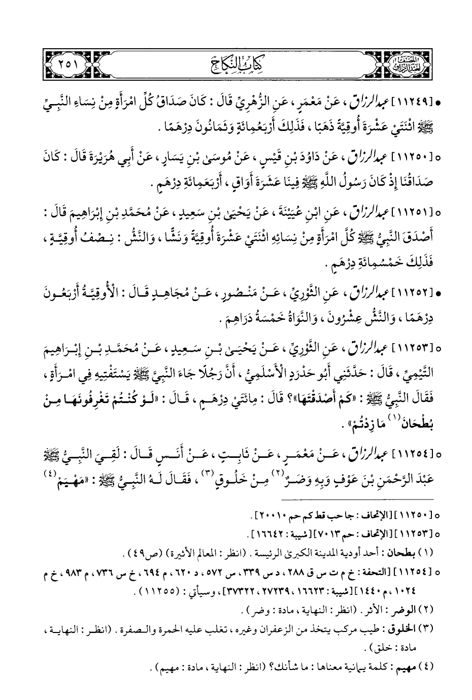 ° [١١٢٥٣] عبد الرزاق، عَنِ الثَّوْريِّ، عَنْ يَحْيَى بْنِ سَعِيدٍ، عَنْ مُحَمَّدِ بْنِ إِبْرَاهِيمَ التَّيْمِيِّ، قَالَ: حَدَّثَنِي أَبُو حَدْرَدٍ الْأَسْلَمِيُّ، أَنَّ رَجُلًا جَاءَ النَّبِيَّ - صلى الله عليه وسلم - يسْتَفْتِيهِ فِي امْرَأَةٍ، فَقَالَ النَّبِيُّ - صلى الله عليه وسلم -: "كَمْ أَصْدَقْتَهَا"؟ قَالَ: مِائَتَي دِرْهَمٍ، قَالَ: "لَوْ كُنْتُمْ تَغْرِفُونَهَا مِنْ بُطْحَانَ (¬١) مَا زِدتُمْ".