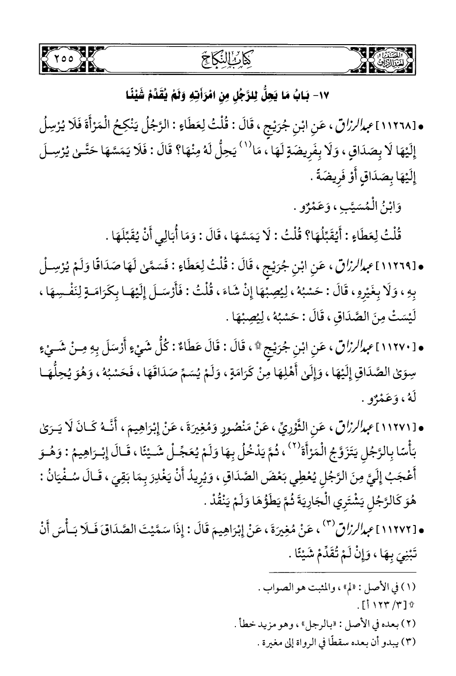 • [١١٢٧٢] عبد الرزاق (¬٣)، عَنْ مُغِيرَةَ، عَنْ إِبْرَاهِيمَ قَالَ: إِذَا سَمَّيْتَ الصَّدَاقَ فَلَا بَأْسَ أَنْ تَبْنِيَ بِهَا، وإِنْ لَمْ تُقَدِّمْ شَيْئًا.