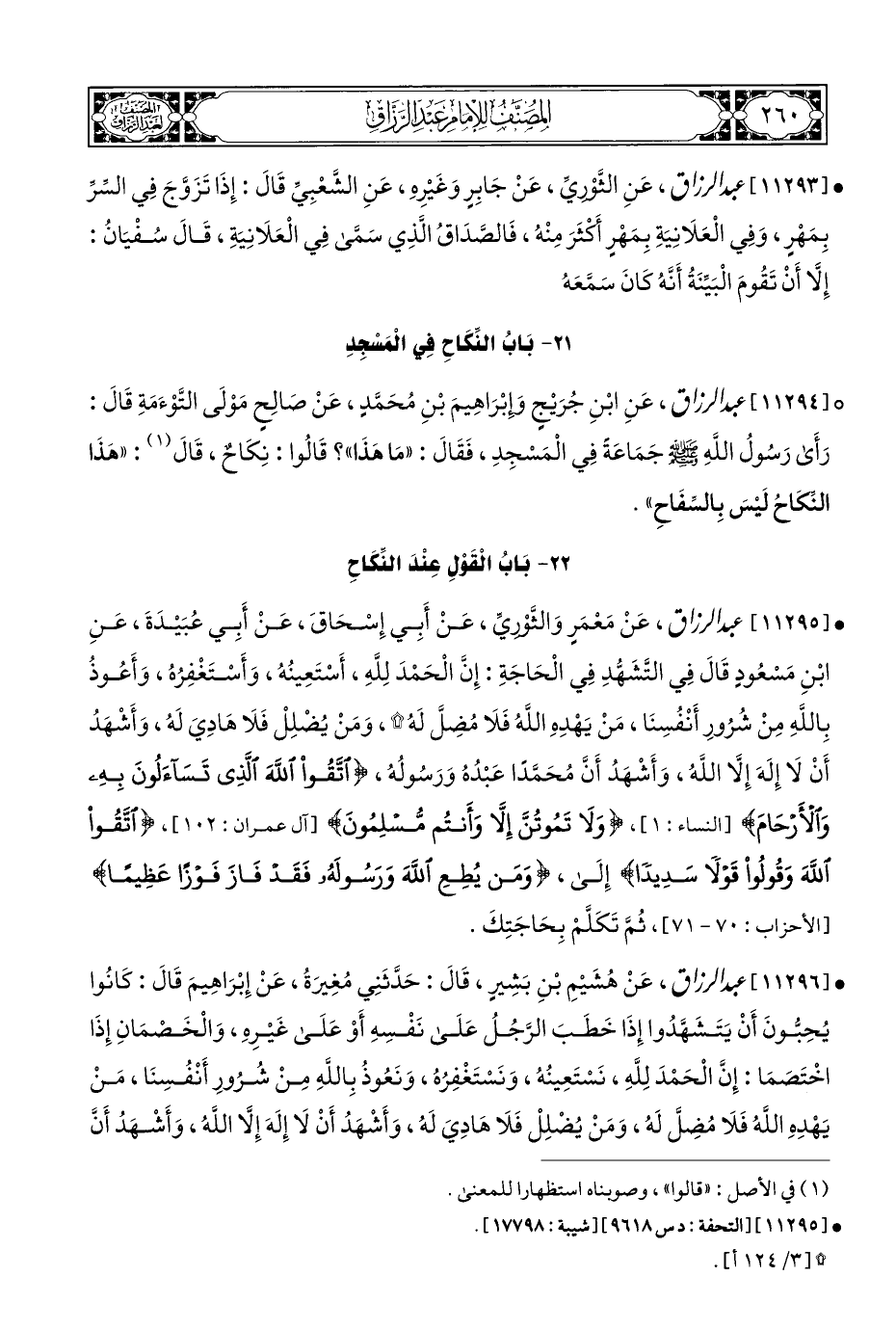 • [١١٢٩٥] عبد الرزاق، عَنْ مَعْمَرٍ وَالثَّوْريِّ، عَنْ أَبِي إِسْحَاقَ، عَنْ أَبِي عُبَيْدَةَ، عَنِ ابْنِ مَسْعُودٍ قَالَ فِي التَّشَهُّدِ فِي الْحَاجَةِ: إِن الْحَمْدَ لِلهِ، أَسْتَعِينُهُ، وَأَسْتَغْفِرُهُ، وَأَعُوذُ بِاللهِ مِنْ شُرُورِ أَنْفُسِنَا، مَنْ يَهْدِهِ اللهُ فَلَا مُضِلَّ لَهُ *، وَمَنْ يُضْلِلْ فَلَا هَادِيَ لَهُ، وَأَشْهَدُ أَنْ لَا إِلَهَ إِلَّا اللهُ، وَأَشْهَدُ أَنَّ مُحَمَّدًا عَبْدُهُ وَرَسُولُهُ، {اتَّقُوا اللَّهَ الَّذِي تَسَاءَلُونَ بِهِ وَالْأَرْحَامَ} [النساء: ١]، {وَلَا تَمُوتُنَّ إِلَّا وَأَنْتُمْ مُسْلِمُونَ} [آل عمران: ١٠٢]، {اتَّقُوا اللَّهَ وَقُولُوا قَوْلًا سَدِيدًا} إِلَى، {وَمَنْ يُطِعِ اللَّهَ وَرَسُولَهُ فَقَدْ فَازَ فَوْزًا عَظِيمًا} [الأحزاب: ٧٠ - ٧١]، ثُمَّ تَكَلَّمْ بِحَاجَتِكَ.