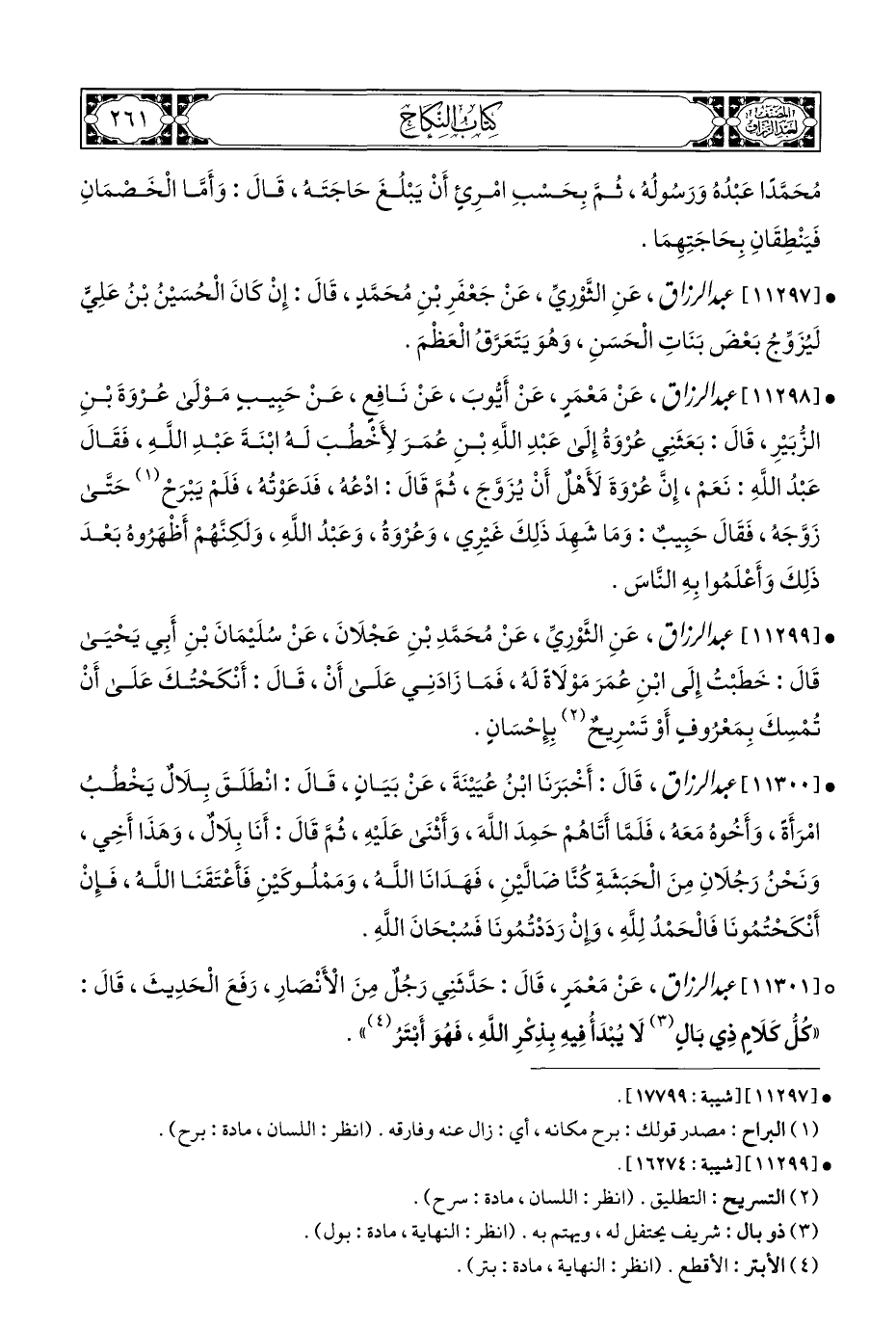 ° [١١٣٠١] عبد الرزاق، عَنْ مَعْمَرٍ، قَالَ: حَدَّثَنِي رَجُلٌ مِنَ الْأَنْصَارِ، رَفَعَ الْحَدِيثَ، قَالَ: "كُلُّ كَلَامٍ ذِي بَالٍ (¬٣) لَا يُبْدَأُ فِيهِ بِذِكْرِ اللهِ، فَهُوَ أَبْتَرُ (¬٤) ".