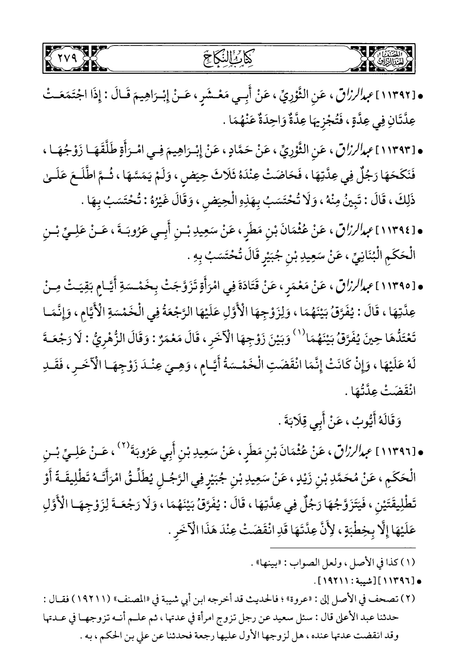 • [١١٣٩٥] عبد الرزاق، عَنْ مَعْمَرٍ، عَنْ قَتَادَةَ فِي امْرَأَةٍ تَزَوَّجَتْ بِخَمْسَةِ أَيَّامٍ بَقِيَتْ مِنْ عِدَّتِهَا، قَالَ: يُفَرَّقُ بَيْنَهُمَا، وَلِزَوْجِهَا الْأَوَّلِ عَلَيْهَا الرَّجْعَةُ فِي الْخَمْسَةِ الْأَيَّامِ، وإِنَّمَا تَعْتَدُّهَا حِينَ يُفَرَّقُ بَيْنَهُمَا (¬١) وَبَيْنَ زَوْجِهَا الآخَرِ، قَالَ مَعْمَرٌ: وَقَالَ الزُّهْرِيُّ: لَا رَجْعَةَ لَهُ عَلَيْهَا، وإِنْ كَانَتْ إِنَّمَا انْقَضَتِ الْخَمْسَةُ أَيَّامٍ، وَهِيَ عِنْدَ زَوْجِهَا الْآخَر، فَقَدِ انْقَضَتْ عِدَّتُهَا.
