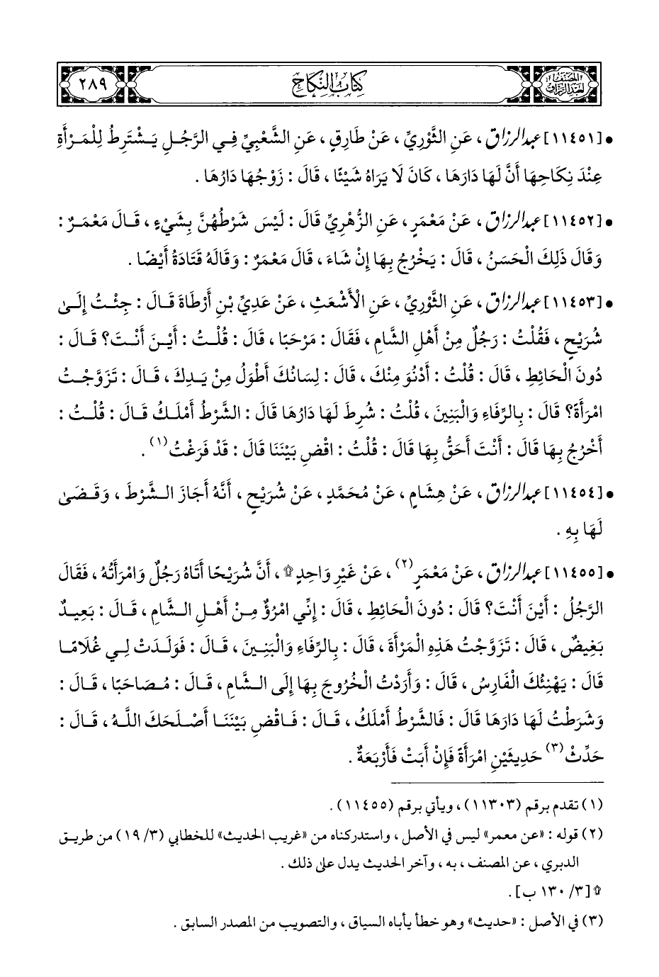 • [١١٤٥٥] عبد الرزاق، عَنْ مَعْمَرٍ (¬٢)، عَنْ غَيْرِ وَاحِدٍ *، أَن شُرَيْحًا أَتَاهُ رَجُلٌ وَامْرَأَتُهُ، فَقَالَ الرَّجُلُ: أَيْنَ أَنْتَ؟ قَالَ: دُونَ الْحَائِطِ، قَالَ: إِنِّي امْرُؤٌ مِنْ أَهْلِ الشَّامِ، قَالَ: بَعِيدٌ بَغِيضٌ، قَالَ: تَزَوَّجْتُ هَذِهِ الْمَرْأَةَ، قَالَ: بِالرِّفَاءَ وَالْبَنِينَ، قَالَ: فَوَلَدَتْ لِي غُلَامًا قَالَ: يَهْنِئُكَ الْفَارِسُ، قَالَ: وَأَرَدْتُ الْخُرُوجَ بِهَا إِلَى الشَّامِ، قَالَ: مُصَاحَبًا، قَالَ: وَشَرَطْتُ لَهَا دَارَهَا قَالَ: فَالشَّرْطُ أَمْلَكُ، قَالَ: فَاقْضِ بَيْنَنَا أَصْلَحَكَ اللَّهُ، قَالَ: حَدِّثْ (¬٣) حَدِيثَيْنِ امْرَأَةً فَإِنْ أَبَتْ فَأَرْبَعَةٌ.