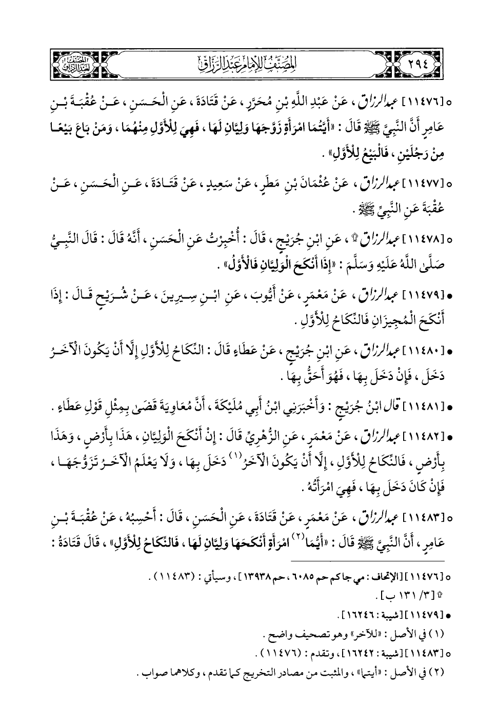 ° [١١٤٧٦] عبد الرزاق، عَنْ عَبْدِ اللَّهِ بْنِ مُحَرَّرٍ، عَنْ قَتَادَةَ، عَنِ الْحَسَنِ، عَنْ عُقْبَةَ بْنِ عَامِرٍ أَنَّ النَّبِي - صلى الله عليه وسلم - قَالَ: "أَيَّتُمَا امْرَأَةٍ زَوَّجَهَا وَلِيَّانِ لَهَا، فَهِيَ لِلْأَوَّلِ مِنْهُمَا، وَمَنْ بَاعَ بَيْعَا مِنْ رَجُلَيْنِ، فَالْبَيْعُ لِلْأَوَّلِ".
