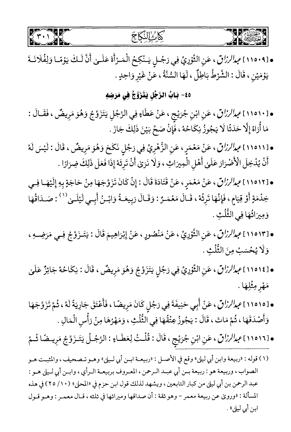 (¬١) قوله: "ربيعة وابن أبي ليلى" وقع في الأصل: "ربيعة ابن أبي ليلى" وهو تصحيف، والمثبت هو الصواب، وربيعة هو: ربيعة بن أبي عبد الرحمن، المعروف بربيعة الرأي، وابن أبي ليلى هو: عبد الرحمن بن أبي ليلى من كبار التابعين، ويشهد لذلك قول ابن حزم في "المحلى" (١٠/ ٢٥) في هذه المسألة: "وروى عن ربيعة معمر - وهو ثقة: أن صداقها وميراثها في ثلثه، قال معمر: وهو قول ابن أبي ليلى".